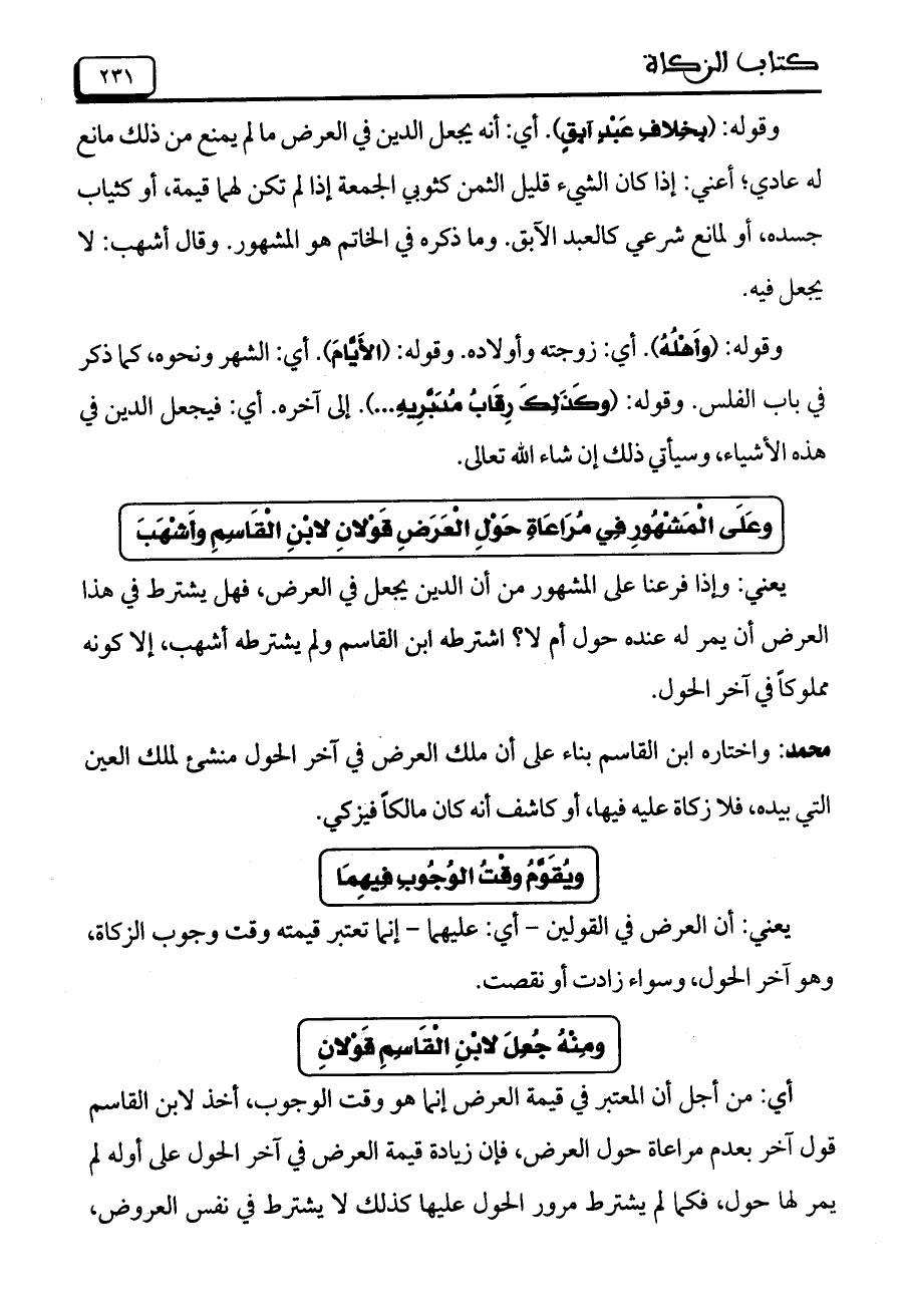وعَلَى الْمَشْهُورِ فِي مُرَاعَاةِ حَوْلِ الْعَرَضِ قَوْلانِ لابْنِ الْقَاسِمِ وأَشْهَبَ