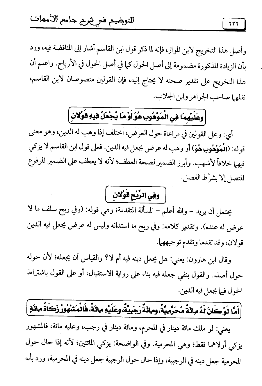 يعني: لو ملك مائة دينار في المحرم، ومائة دينار في رجب، وعليه مائة، فالمشهور يزكي أولاهما فقط؛ وهي المحرمية. وفي الواضحة: يزكي المائتين؛ لأنه إذا حال حول المحرمية جعل دينه في الرجبية، وإذا حال حول الرجبية جعل دينه في المحرمية، ورد بأنه