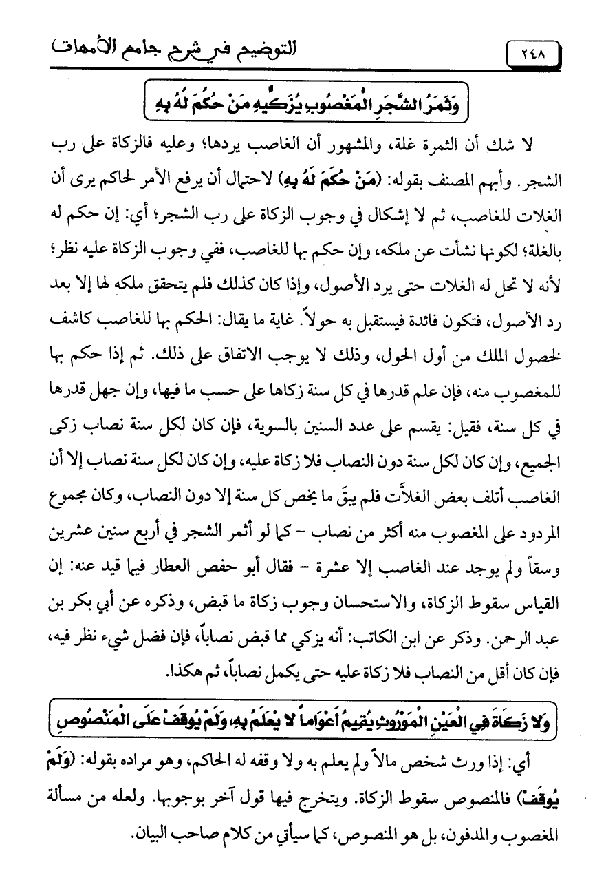 لا شك أن الثمرة غلة، والمشهور أن الغاصب يردها؛ وعليه فالزكاة على رب الشجر. وأبهم المصنف بقوله: (مَنْ حُكَّمَ لَهُ بِهِ) لاحتمال أن يرفع الأمر لحاكم يرى أن الغلات للغاصب، ثم لا إشكال في وجوب الزكاة على رب الشجر؛ أي: إن حكم له بالغلة؛ لكونها نشأت عن ملكه، وإن حكم بها للغاصب، ففي وجوب الزكاة عليه نظر؛ لأنه لا تحل له الغلات حتى يرد الأصول، وإذا كان كذلك فلم يتحقق ملكه لها إلا بعد رد الأصول، فتكون فائدة فيستقبل به حولاً. غاية ما يقال: الحكم بها للغاصب كاشف لحصول الملك من أول الحول، وذلك لا يوجب الاتفاق على ذلك. ثم إذا حكم بها للمغصوب منه، فإن علم قدرها في كل سنة زكاها على حسب ما فيها، وإن جهل قدرها في كل سنة، فقيل: يقسم على عدد السنين بالسوية، فإن كان لكل سنة نصاب زكى الجميع، وإن كان لكل سنة دون النصاب فلا زكاة عليه، وإن كان لكل سنة نصاب إلا أن الغاصب أتلف بعض الغلاَّت فلم يبقَ ما يخص كل سنة إلا دون النصاب، وكان مجموع المردود على المغصوب منه أكثر من نصاب- كما لو أثمر الشجر في أربع سنين عشرين وسقاً ولم يوجد عند الغاصب إلا عشرة- فقال أبو حفص العطار فيما قيد عنه: إن القياس سقوط الزكاة، والاستحسان وجوب زكاة ما قبض، وذكره عن أبي بكر بن عبد الرحمن. وذكر عن ابن الكاتب: أنه يزكي مما قبض نصاباً، فإن فضل شيء نظر فيه، فإن كان أقل من النصاب فلا زكاة عليه حتى يكمل نصاباً، ثم هكذا.