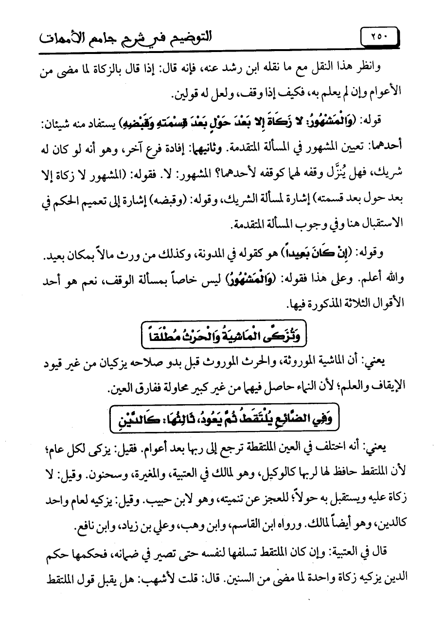 قوله: (وَالْمَشْهُورُ: لا زَكَاةَ إِلا بَعْدَ حَوْلٍ بَعْدَ قِسْمَتهِ وَقَبْضِهِ) يستفاد منه شيئاً: أحدهما: تعيين المشهور في المسألة المتقدمة. وثانيهما: إفادة فرع آخر، وهو أنه لو كان له شريك، فهل يُنَّزل وقفه لهما كوقفه لأحدهما؟ المشهور: لا. فقوله: (المشهور لا زكاة إلا بعد حول بعد قسمته) إشارة لمسألة الشريك، وقوله: (وقبضه) إشارة إلى تعميم الحكم في الاستقبال هنا وفي وجوب المسألة المتقدمة.