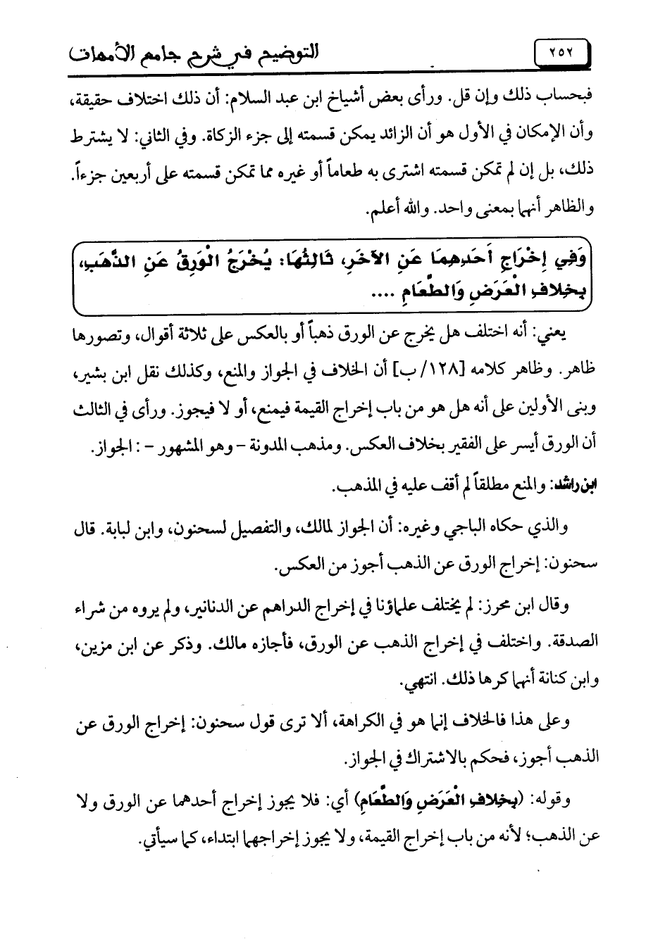 وقال ابن محرز: لم يختلف علماؤنا في إخراج الدراهم عن الدنانير، ولم يروه من شراء الصدقة. واختلف في إخراج الذهب عن الورق، فأجازه مالك. وذكر عن ابن مزين، وابن كنانة أنهما كرها ذلك. انتهى.