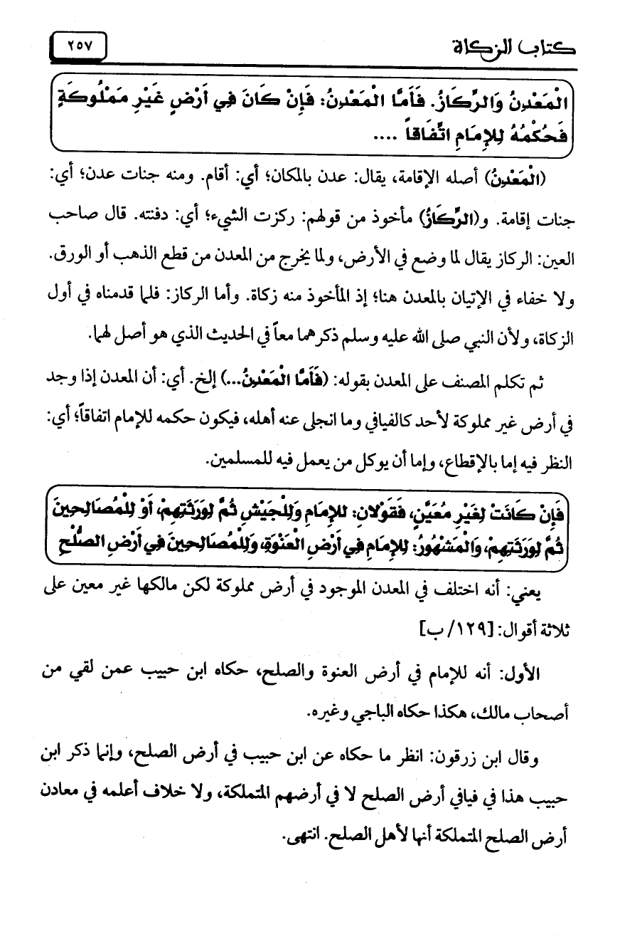 وقال ابن زرقون: انظر ما حكاه عن ابن حبيب في أرض الصلح، وإنما ذكر ابن حبيب هذا في فيافي أرض الصلح لا في أرضهم المتملكة، ولا خلاف أعلمه في معادن أرض الصلح المتملكة أنها لأهل الصلح. انتهى.