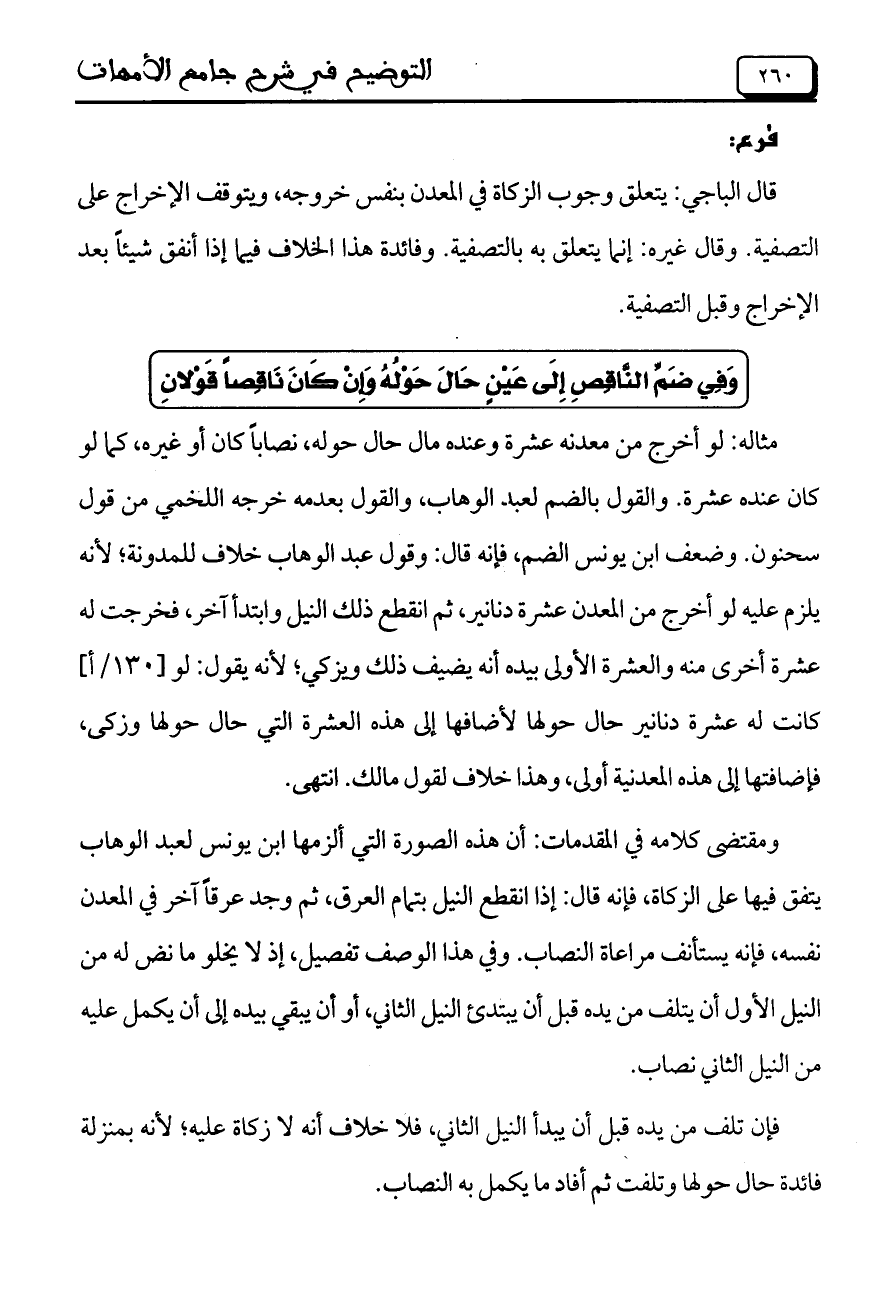 مثاله: لو أخرج من معدنه عشرة وعنده مال حال حوله، نصاباً كان أو غيره، كما لو كان عنده عشرة. والقول بالضم لعبد الوهاب، والقول بعدمه خرجه اللخمي من قول سحنون. وضعف ابن يونس الضم، فإنه قال: وقول عبد الوهاب خلاف للمدونة؛ لأنه يلزم عليه لو أخرج من المعدن عشرة دنانير، ثم انقطع ذلك النيل وابتدأ آخر، فخرجت له عشرة أخرى منه والعشرة الأولى بيده أنه يضيف ذلك ويزكي؛ لأنه يقول: لو [130/ أ] كانت له عشرة دنانير حال حولها لأضافها إلى هذه العشرة التي حال حولها وزكى، فإضافتها إلى هذه المعدنية أولى، وهذا خلاف لقول مالك. انتهى.