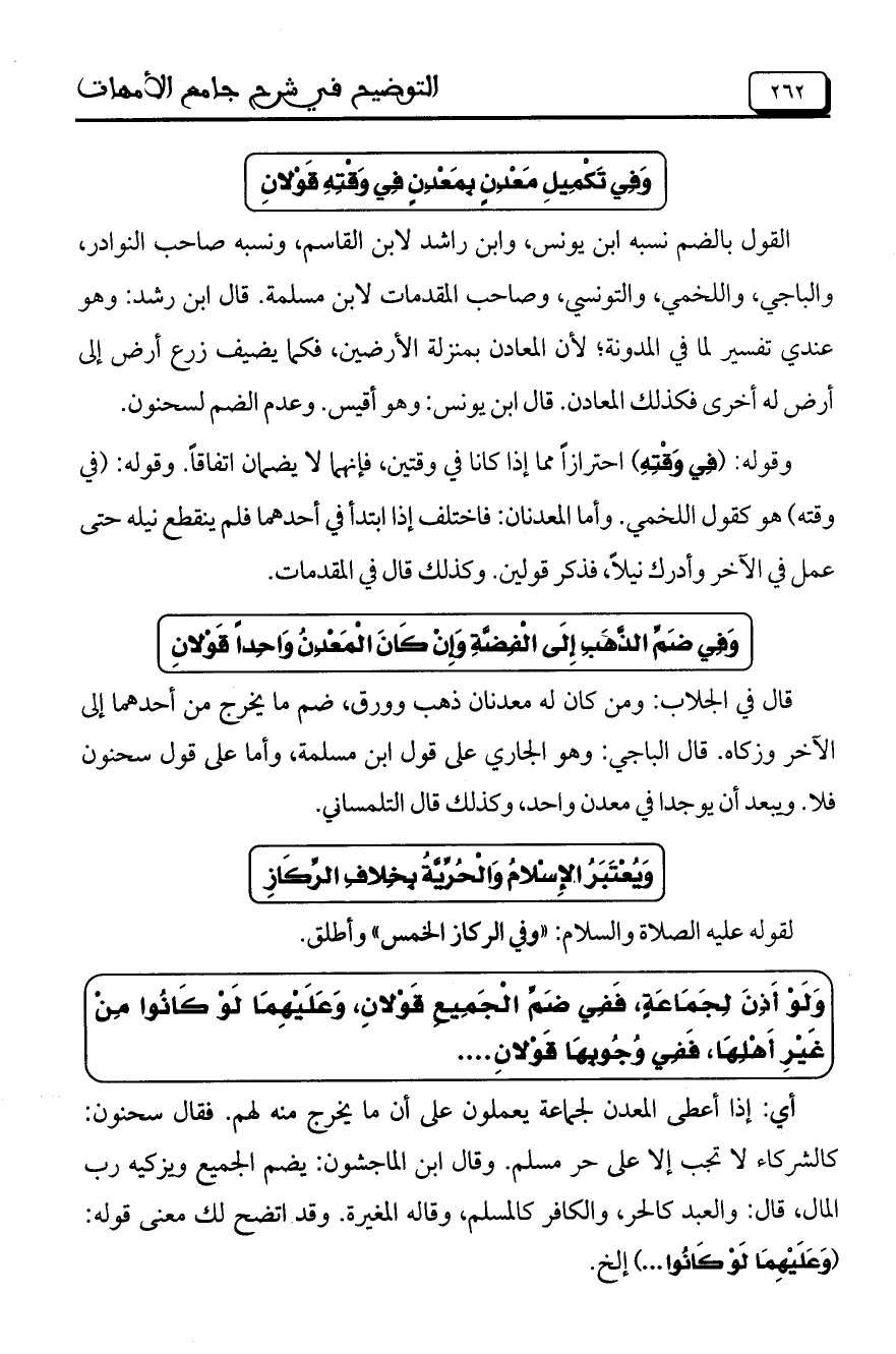 القول بالضم نسبه ابن يونس، وابن راشد لابن القاسم، ونسبه صاحب النوادر، والباجي، واللخمي، والتونسي، وصاحب المقدمات لابن مسلمة. قال ابن رشد: وهو عندي تفسير لما في المدونة؛ لأن المعادن بمنزلة الأرضين فكما يضيف زرع أرض الي أرض له أخرى فكذلك المعادن. قال ابن يونس: وهو أقيس. وعدم الضم لسحنون.