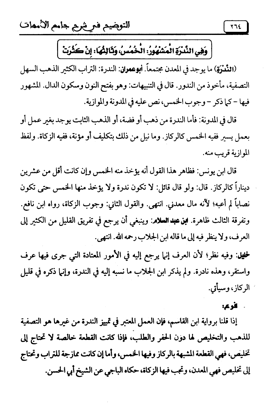 (النَّدْرَةِ) ما يوجد في المعدن مجتمعاً. أبو عمران: الندرة: التراب الكثير الذهب السهل التصفية، مأخوذ من الندور. قال في التنبيهات: وهو بفتح النون وسكون الدال. المشهور فيها- كما ذكر- وجوب الخمس، نص عليه في المدونة والموازية.
