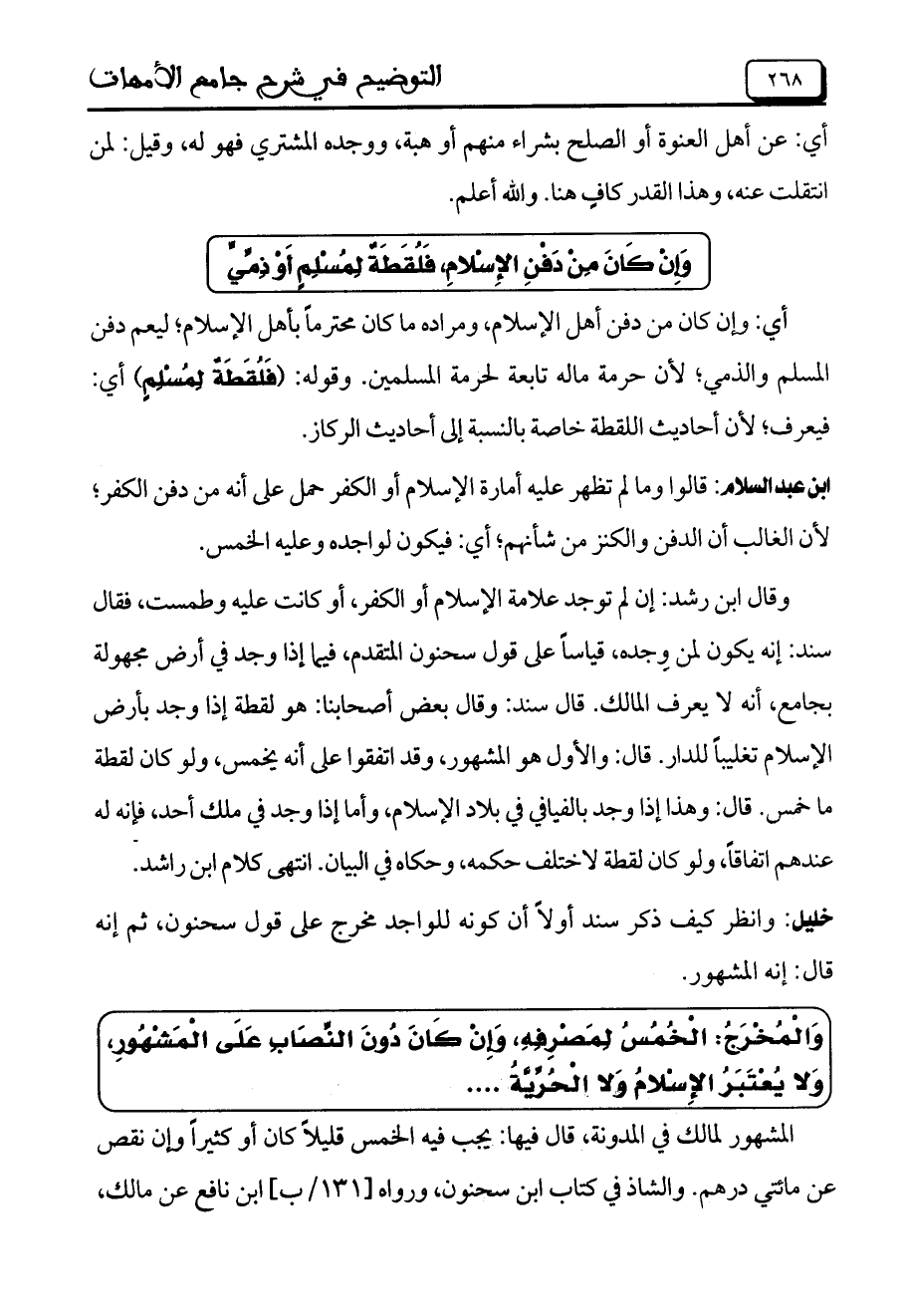 وقال ابن رشد: إن لم توجد علامة الإسلام أو الكفر، أو كانت عليه وطمست، فقال سند: إنه يكون لمن وجده، قياساً على قول سحنون المتقدم، فيما إذا وجد في أرض مجهولة بجامع، أنه لا يعرف المالك. قال سند: وقال بعض أصحابنا: هو لقطة إذا وجد بأرض الإسلام تغليباً للدار. قال: والأول هو المشهور، وقد اتفقوا على أنه يخمس، ولو كان لقطه ما خمس. قال: وهذا إذا وجد بالفيافي في بلاد الإسلام، وأما إذا وجد في ملك أحد، فإنه له عندهم اتفاقاً، ولو كان لقطة لاختلف حكمه، وحكاه في البيان. انتهى كلام ابن راشد.