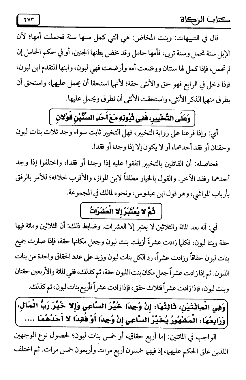 قال في التنبيهات: وبنت المخاض: هي التي كمل سنها سنة فحملت أمها؛ لأن الإبل سنة تحمل وسنة تربي، فأمها حامل وقد مخض بطنها الجنين، أو في حكم الحامل إن لم تحمل، فإذا كمل لها سنتان ووضعت أمه وأرضعت فهي لبون، وابنها المتقدم ابن لبون، فإذا دخل في الرابع فهو حق والأنثى حقة؛ لأنهما استحقا أن يحمل عليهما، واستحق أن يطرق منهما الذكر الأنثى، واستحقت الأنثى أن تطرق ويحمل عليها.