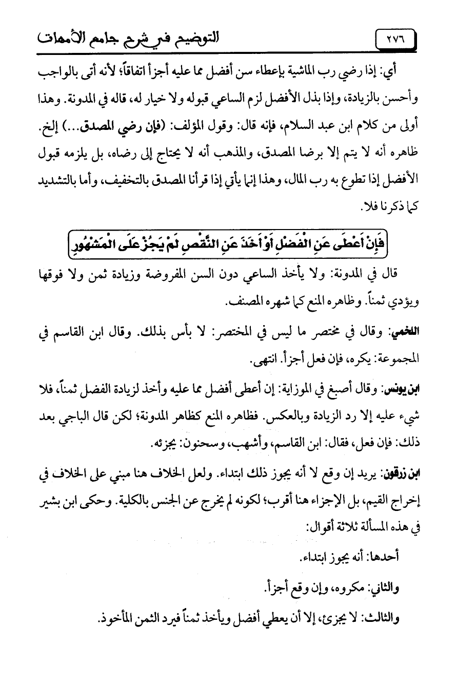 ابن زرقون: يريد إن وقع لا أنه يجوز ذلك ابتداء. ولعل الخلاف هنا مبني على الخلاف في إخراج القيم، بل الإجزاء هنا أقرب؛ لكونه لم يخرج عن الجنس بالكلية. وحكى ابن بشير في هذه المسألة ثلاثة أقوال: