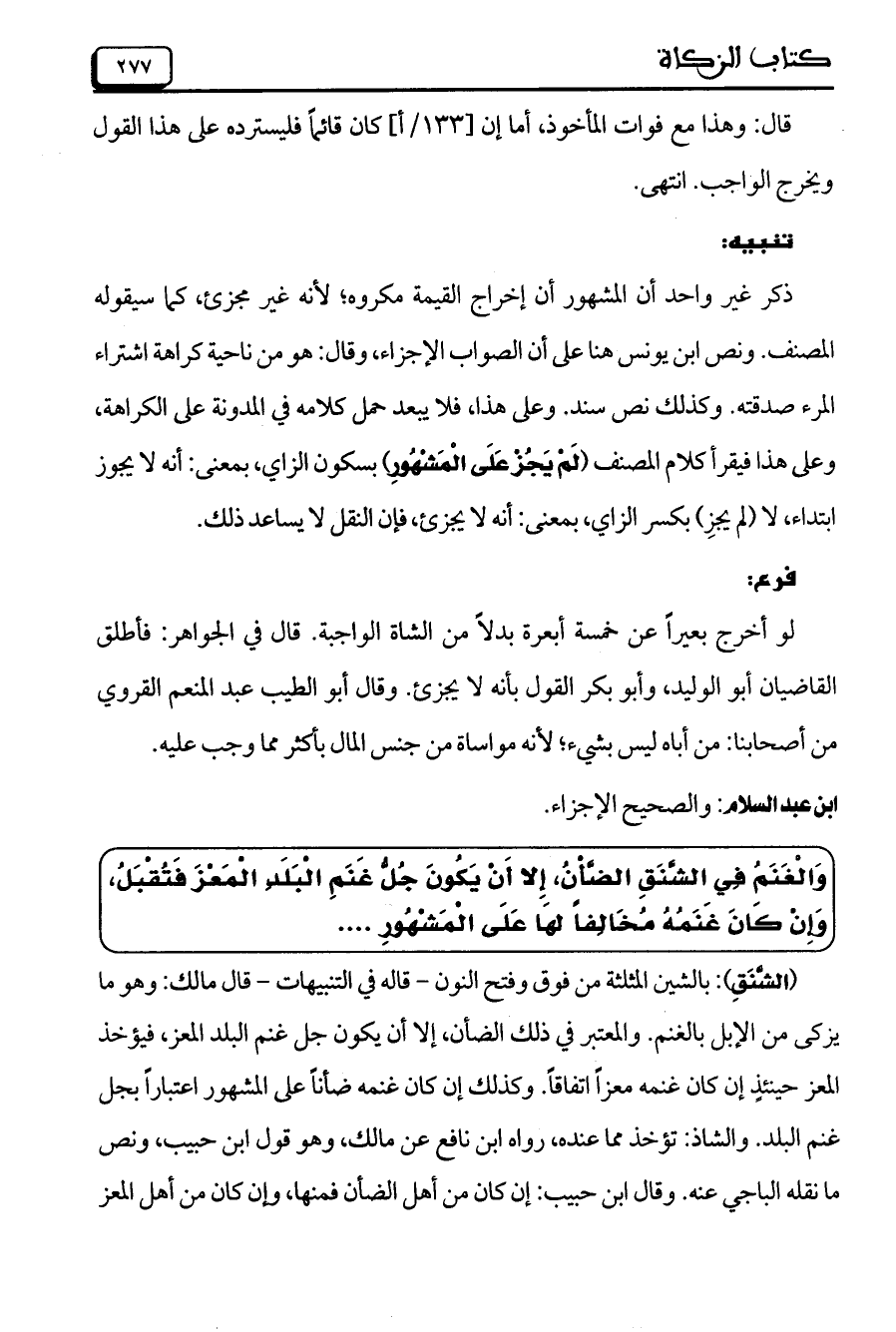 (الشَّنَقِ): بالشين المثلثة من فوق وفتح النون- قاله في التنبيهات- قال مالك: وهو ما يزكى من الإبل بالغنم. والمعتبر في ذلك الضأن، إلا أن يكون جل غنم البلد المعز، فيؤخذ المعز حيئنذٍ إن كان غنمه معزاً اتفاقاً. وكذلك إن كان غنمه ضأناً على المشهور اعتباراً بجل غنم البلد. والشاذ: تؤخذ مما عنده، رواه ابن نافع عن مالك، وهو قول ابن حبيب، ونص ما نقله الباجي عنه. وقال ابن حبيب: إن كان من أهل الضأن فمنها، وإن كان من أهل المعز