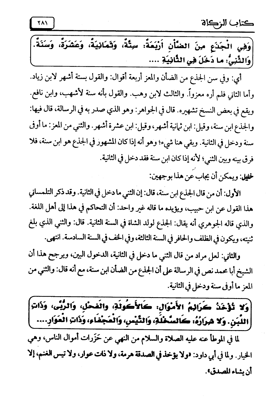 والثاني: لعل مراد من قال الثني ما دخل في الثانية، الدخول البين، ويرجح هذا أن الشيخ أبا محمد نص في الرسالة على أن الجذع من الضأن ابن سنة، مع أنه قال: والثني من المعز ما أوفى سنة ودخل في الثانية.