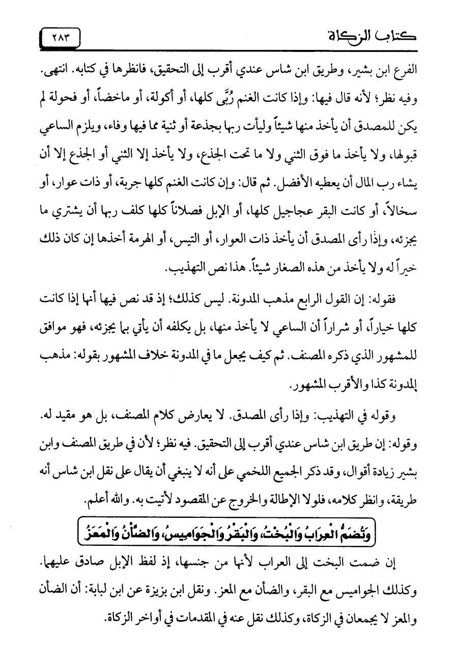 إن ضمت البخت إلى العراب لأنها من جنسها، إذ لفظ الإبل صادق عليهما. وكذلك الجواميس مع البقر، والضأن مع المعز. ونقل ابن بزيزة عن ابن لبابة: أن الضأن والمعز لا يجمعان في الزكاة، وكذلك نقل عنه في المقدمات في أواخر الزكاة.