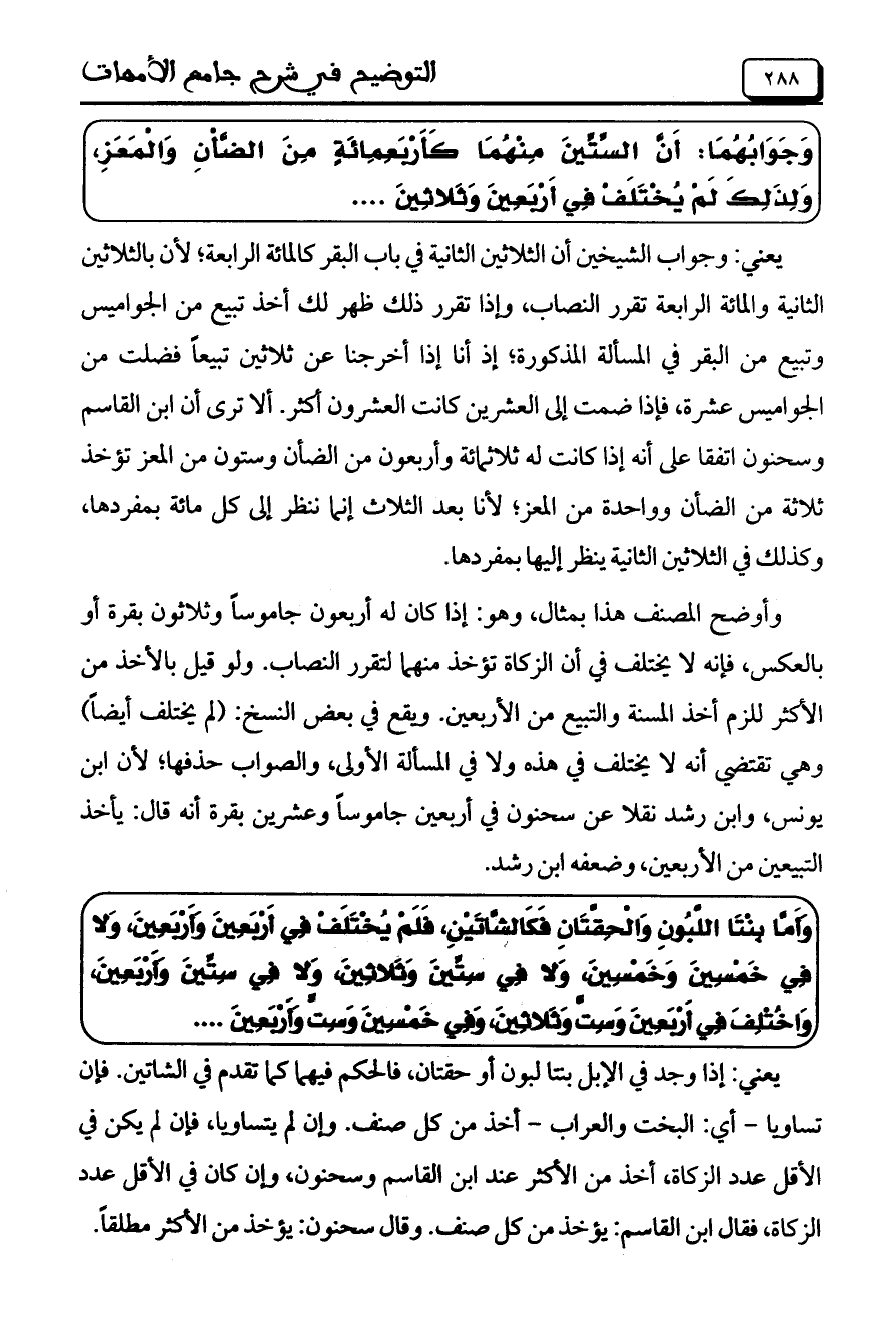 يعني: وجواب الشيخين أن الثلاثين الثانية في باب البقر كالمائة الرابعة؛ لأن بالثلاثين الثانية والمائة الرابعة تقرر النصاب، وإذا تقرر ذلك ظهر لك أخذ تبيع من الجواميس وتبيع من البقر في المسألة المذكورة؛ إذ أنا إذا أخرجنا عن ثلاثين تبيعاً فضلت من الجواميس عشرة، فإذا ضمت إلى العشرين كانت العشرون أكثر. ألا ترى أن ابن القاسم وسحنون اتفقا على أنه إذا كانت له ثلاثمائة وأربعون من الضأن وستون من المعز تؤخذ ثلاثة من الضأن وواحدة من المعز؛ لأنا بعد الثلاث إنما ننظر إلى كل مائة بمفردها، وكذلك في الثلاثين الثانية ينظر إليها بمفردها.