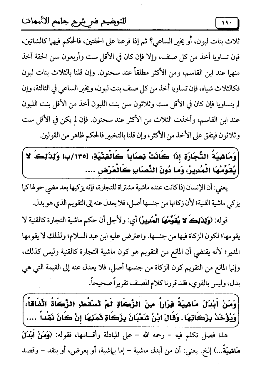 وَمَاشِيَةُ التِّجَارَةِ إَذَا كَانَتْ نِصَاباً كَالْقِنْيَةِ، [135/ ب] وَلِذَلِكَ لا يُقَوِّمُهَا الْمُدِيرُ، وَما دُونَ النِّصَابِ كَالْعَرْضِ ..