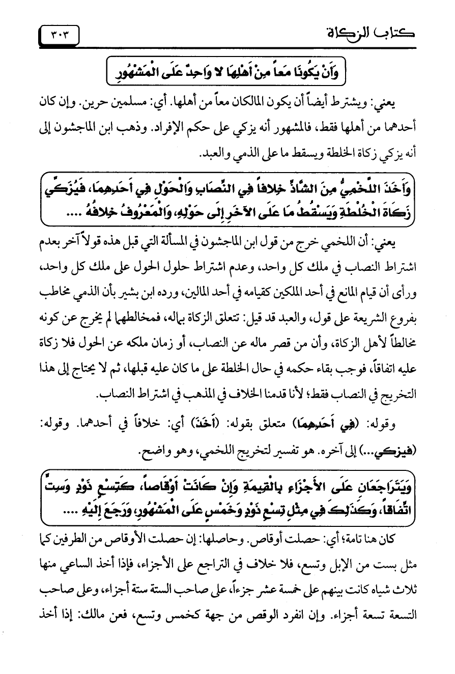 يعني: ويشترط أيضاً أن يكون المالكان معاً من أهلها. أي: مسلمين حرين. وإن كان أحدهما من أهلها فقط، فالمشهور أنه يزكي على حكم الإفراط. وذهب ابن الماجشون إلى أنه يزكي زكاة الخلطة ويسقط ما على الذمي والعبد.