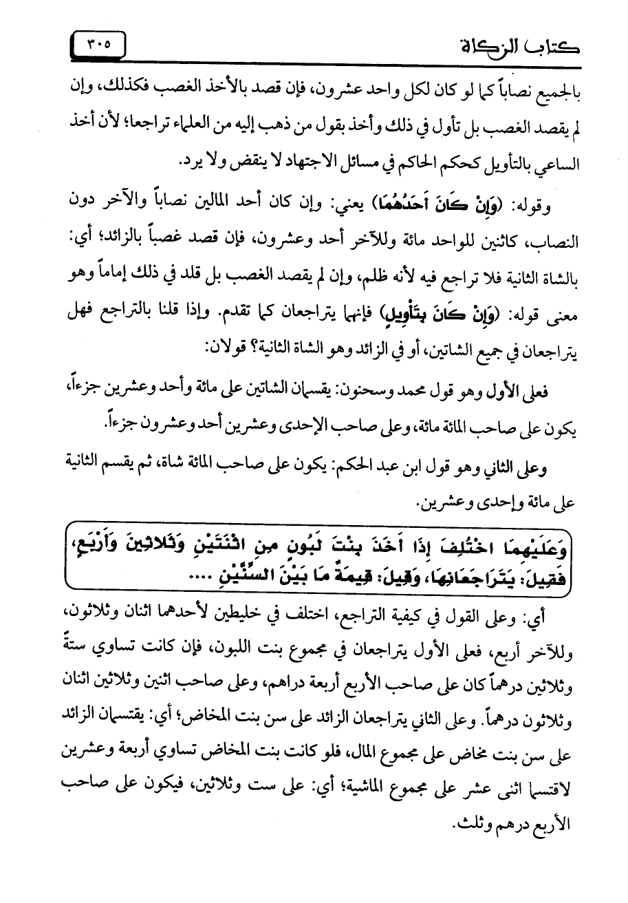 وَعَلَيْهِمَا اخْتُلِفَ إِذَا أَخَذَ بِنْتَ لَبُونٍ مِنِ اثْنَتَيْنِ وَثَلاثِينَ وَأَرْبَعٍ، فَقِيلَ: يَتَرَاجَعَانِهَا، وَقِيلَ: قِيمَةُ مَا بَيْنَ السِّنَّيْنِ ....