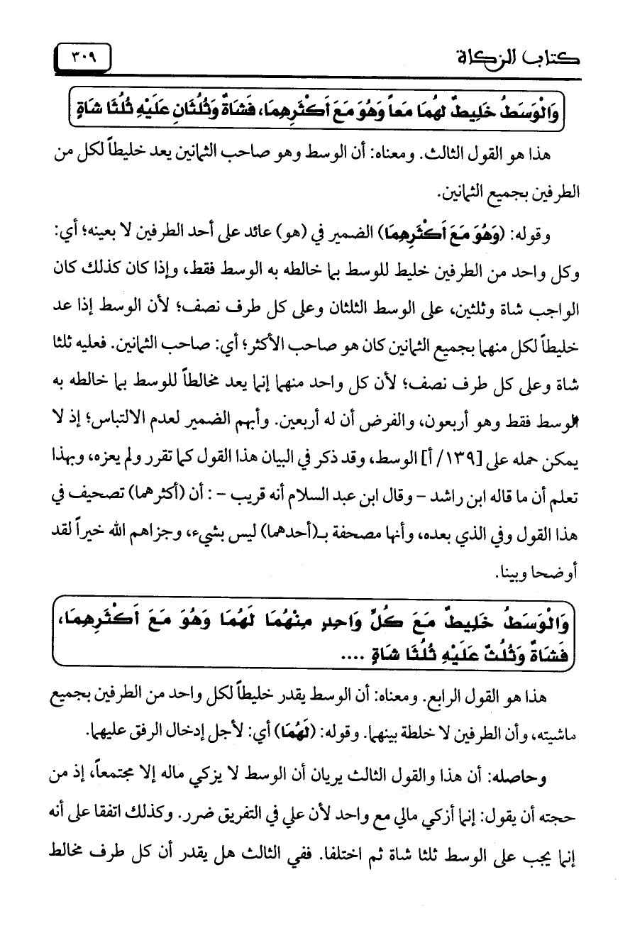 وحاصله: أن هذا والقول الثالث يريان أن الوسط لا يزكي ماله إلا مجتمعاً، إذ من حجته أن يقول: إنما أزكي مالي مع واحد لأن على في التفريق ضرر. وكذلك اتفقا على أنه إنما يجب على الوسط ثلثا شاة ثم اختلفا. ففي الثالث هل يقدر أن كل طرف مخالط