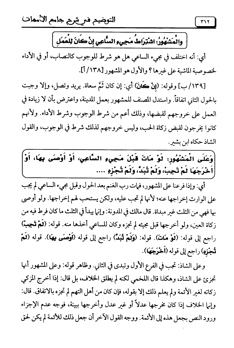 [139/ ب] وقوله: (إَنْ كَانَ) أي: إن كان ثَمَّ سعاة. يريد وتصل، وإلا وجبت بالحول الثاني اتفاقاً. واستدل المصنف للمشهور بعمل المدينة، واعترض بأن لا زيادة في العمل على خروجهم لقبضها، وذلك أعم من شرط الوجوب وشرط الأداء. ولأنهم كانوا يخرجون لقبض زكاة الحب، وليس خروجهم لذلك شرط في الوجوب، والقول الشاذ حكاه ابن بشير.