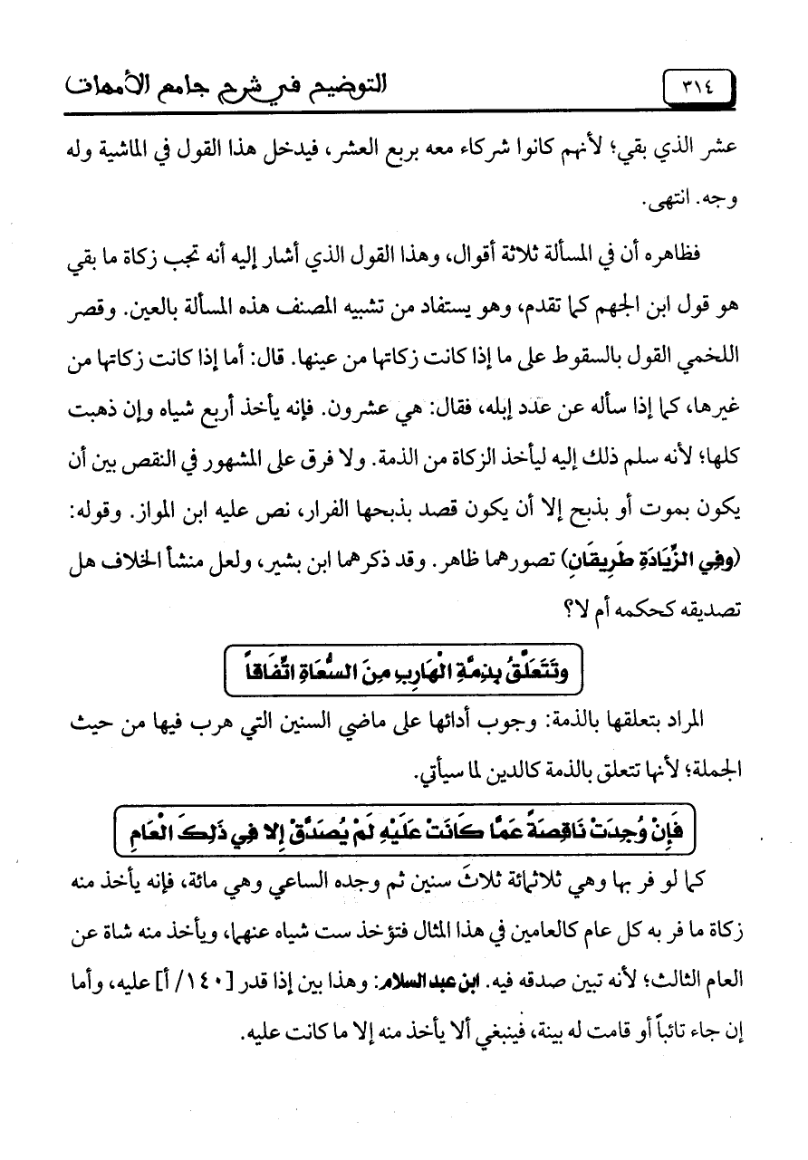 فظاهره أن في المسألة ثلاثة أقوال، وهذا القول الذي أشار إليه تجب زكاة ما بقي هو قول ابن الجهم كما تقدم، وهو يستفاد من تشبيه المصنف هذه المسألة بالعين. وقصر اللخمي القول بالسقوط على ما إذا كانت زكاتها من عينها. قال: أما إذا كانت زكاتها من غيرها، كما إذا سأله عن عدد إبله، فقال: هي عشرون. فإنه يأخذ أربع شياه وإن ذهبت كلها؛ ٍلأنه سلم ذلك إليه ليأخذ الزكاة من الذمة. ولا فرق على المشهور في النقص بين أن يكون بموت أو بذبح إلا أن يكون قصد بذبحها الفرار، نص عليه ابن المواز. وقوله: (وَفِي الزِّيَادَةِ طَرِيقَانِ) تصورهما ظاهر. وقد ذكرهما ابن بشير، ولعل منشأ الخلاف هل تصديقه كحكمه أم لا؟