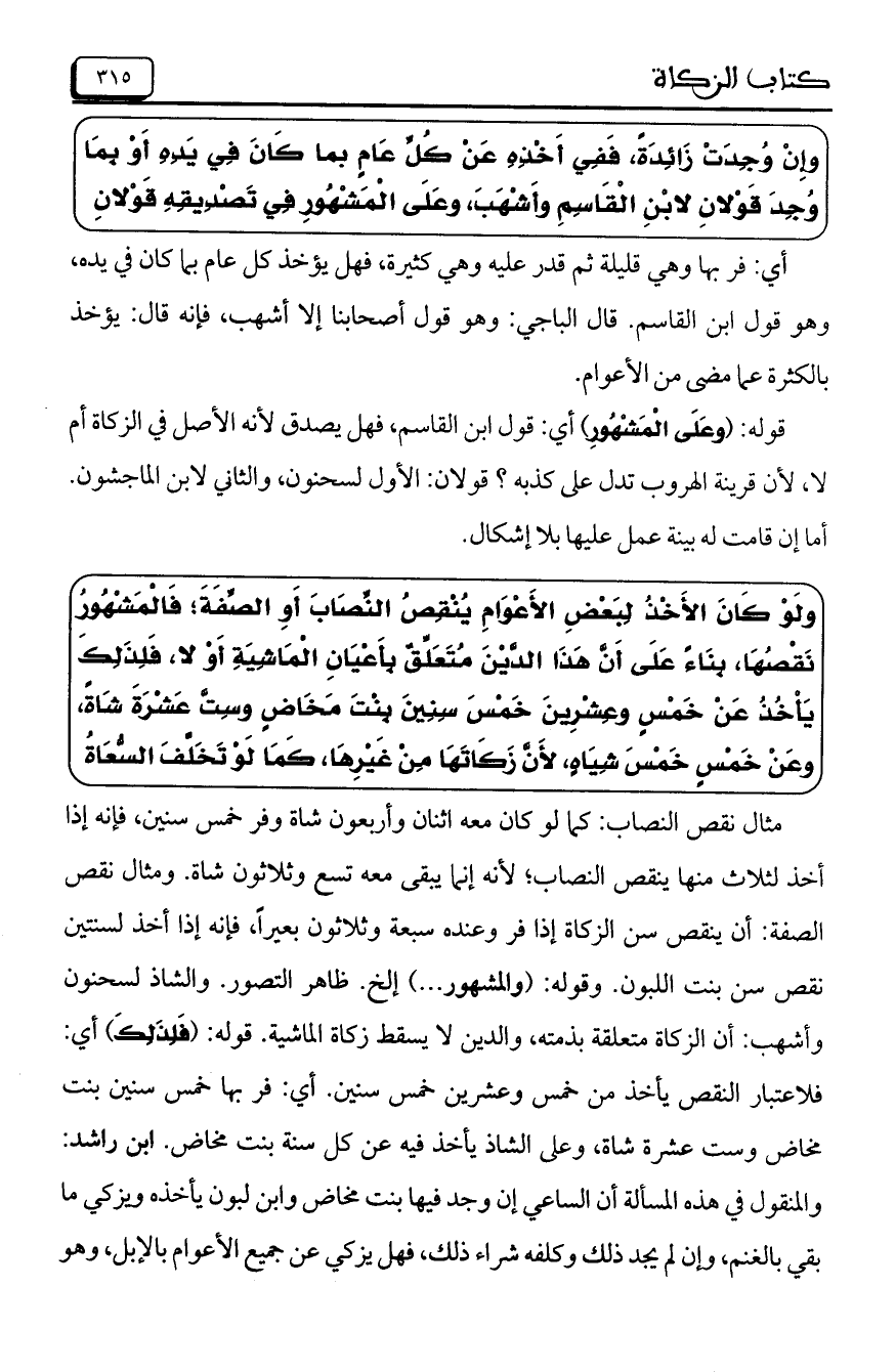 مثال نقص النصاب: كما لو كان معه اثنان وأربعون شاة وفر خمس سنين، فإنه إذا أخذ لثلاث منها ينقص النصاب؛ لأنه إنما يبقى معه تسع وثلاثون شاة. ومثال نقص الصفة: أن ينقص سن الزكاة إذا فر وعنده سبعة وثلاثون بعيراً، فإنه إذا أخذ لسنتين نقص سن بنت اللبون. وقوله: (والمشهور ...) إلخ. ظاهر التصور. والشاذ لسحنون وأشهب: أن الزكاة متعلقة بذمته، والدين لا يسقط زكاة الماشية. قوله: (فَلِذَلِكَ) أي: فلاعتبار النقص يأخذ من خمس وعشرين خمس سنين. أي: فر بها خمس سنين بنت مخاض وست عشرة شاة، وعلى الشاذ يأخذ فيه عن كل سنة بنت مخاض. ابن راشد: والمنقول في هذه المسألة أن الساعي إن وجد فيها بنت مخاض وابن لبون يأخذه ويزكي ما بقي بالغنم، وإن لم يجد ذلك وكلفه شراء ذلك، فهل يزكي عن جميع الأعوام بالإبل، وهو