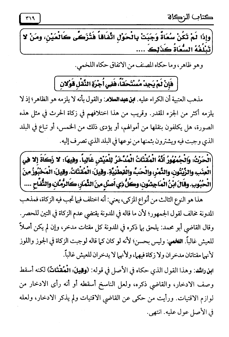 ابن راشد: وهذا القول الذي حكاه في الأصل في قوله: (وَقِيلَ: الْمُقْتَاتُ) لكنه أسقط وصف الادخار، والقاضي ذكره، ولعل الناسخ أسقطه أو أنه رأى الادخار من لوازم الاقتيات. ورأيت من حكى عن القاضي الاقتيات ولم يذكر الادخار، ولعله في الأصل عول عليه. انتهى.