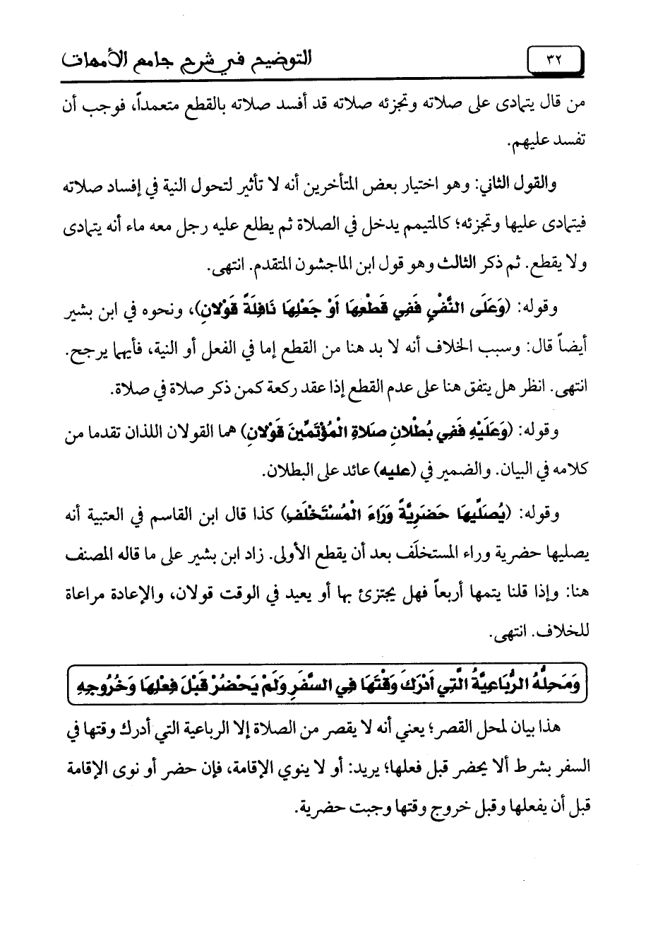 والقول الثاني: وهو اختيار بعض المتأخرين أنه لا تأثير لتحول النية في إفساد صلاته فيتمادى عليها وتجزئه؛ كالمتيمم يدخل في الصلاة ثم يطلع عليه رجل معه ماء أنها يتمادى ولا يقطع. ثم ذكر الثالث وهو قول ابن الماجشون المتقدم. انتهى.