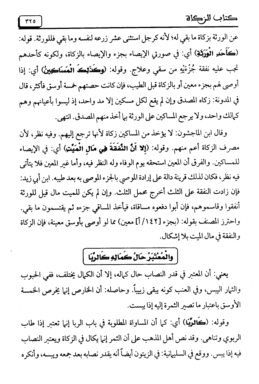 عن الورثة بزكاة ما بقي له؛ لأنه كرجل استثنى عشر زرعه لنفسه وما بقي فللورثة. قوله: (كَأَحَدِ الْوَرَثَةِ) أي: في صورتي الإيصاء بجزء والإيصاء بالزكاة، ولكونه كأحدهم تجب عليه نفقة جُزْءَيْهِ من سقي وعلاج. وقوله: (وكَذَلِكَ الْمَسَاكِينُ) أي: إذا أوصى لهم بجزء معين أو بالزكاة قبل الطيب، فإن كانت حصتهم خمسة أوسق فأكثر، قال في المدونة: زكاه المصق وإن لم يقع لكل مسكين إلا مد واحد، إذ ليسوا بأعيانهم وهم كمالك واحد، ولا يرجع المساكين على الورثة بما أخذ منهم المصدق. انتهى.
