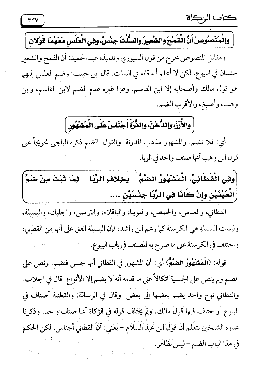 وفِي الْقَطَانِيِّ: الْمَشْهُورُ الضَّمُّ- بِخِلافِ الرِّبَا- لِمَا ثَبَتَ مِنْ ضَمِّ الْعَيْنَيْنِ وإِنْ كَانَا فِي الرِّبَا جِنْسَيْنِ ...