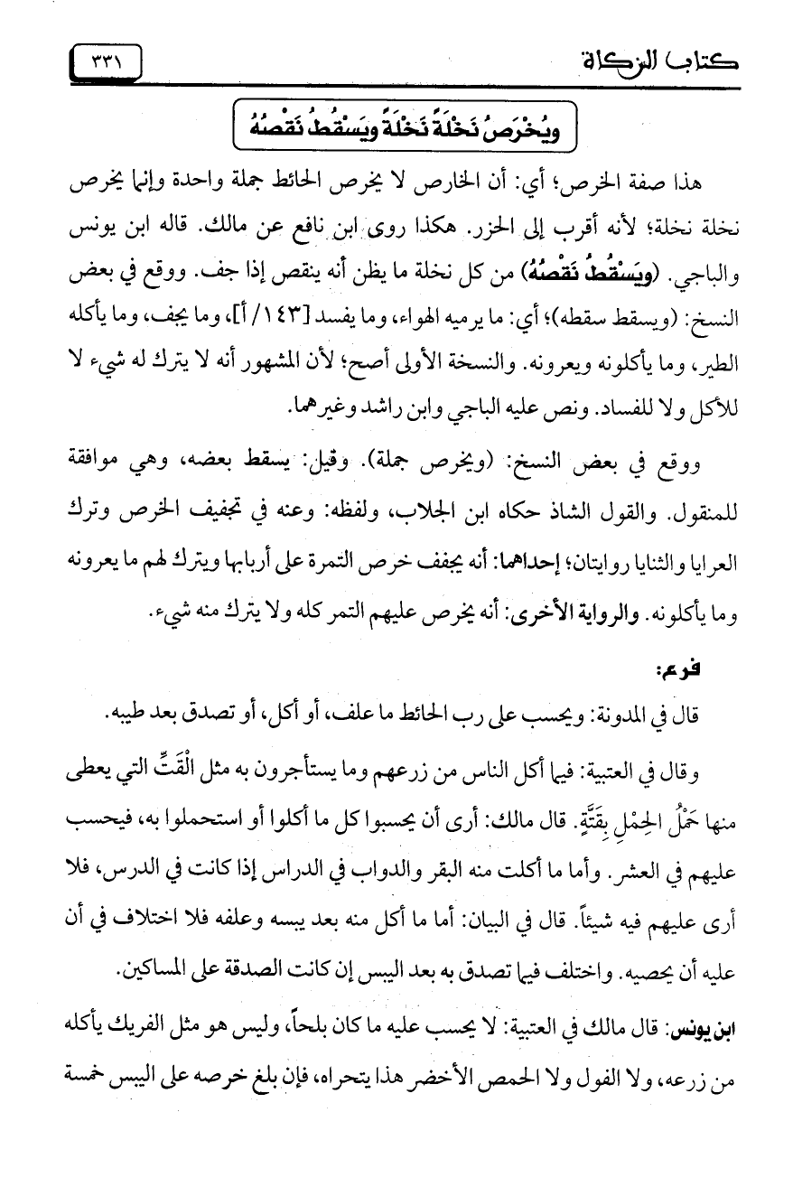 ابن يونس: قال مالك في العتبية: لا يحسب عليه ما كان بلحاً، وليس هو مثل الفريك يأكله من زرعه، ولا الفول ولا الحمص الأخضر هذا يتحراه، فإن بلغ خرصه على اليبس خمسة