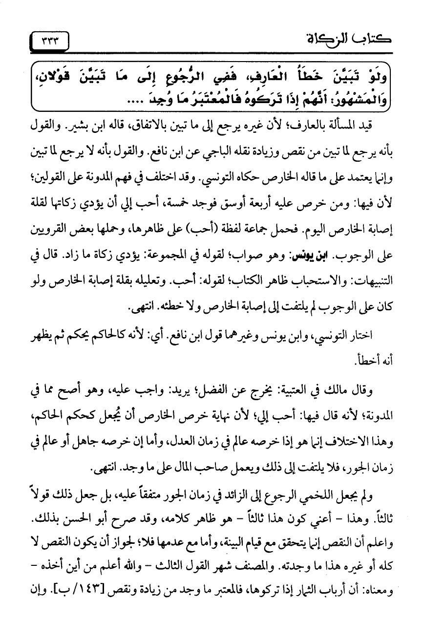 وقال مالك في العتبية: يخرج عن الفضل؛ يريد: واجب عليه، وهو أصح مما في المدونة؛ لأنه قال فيها: أحب إلي؛ لأن نهاية خرص الخارص أن يُجعل كحكم الحاكم، وهذا الاختلاف إنما هو إذا خرصه عالم في زمان العدل، وأما إن خرصه جاهل أو عالم في زمان الجور، فلا يلتفت إلى ذلك ويعمل صاحب المال على ما وجد. انتهى.