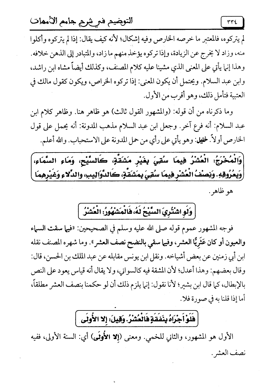 فوجه المشهور عموم قوله صلى الله عليه وسلم في الصحيحين: "فيما سقت السماء والعيون أو كان عثرياً العشر، وفيما سقي بالنضح نصف العشر". وما شهره المصنف نقله ابن أبي زمنين عن بعض أشياخه. ونقل ابن يونس مقابله عن عبد الملك بن الحسن، قال: وقال بعضهم: وهذا أعدل؛ لأن المشقة فيه كالسواني، ولا يقال أنه قياس يعود على النص بالإبطال، كما قال ابن بشير؛ لأنا نقول: إنما يلزم ذلك أن لو حكمنا بنصف العشر مطلقاً، أما إذا قلنا به في صورة فلا.