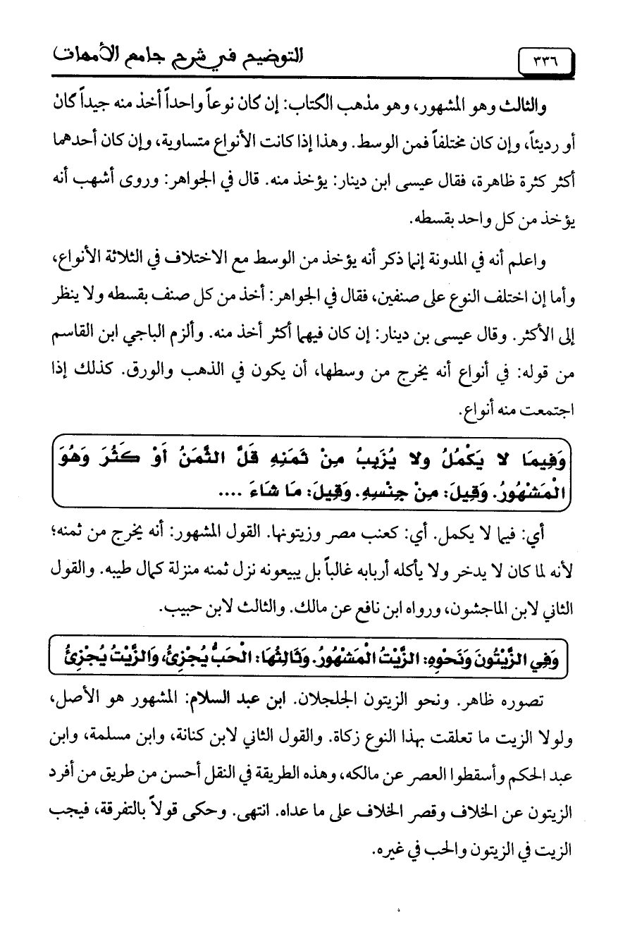 واعلم أنه في المدونة إنما ذكر أنه يؤخذ من الوسط مع الاختلاف في الثلاثة الأنواع، وأما إن اختلف النوع على صنفين، فقال في الجواهر: أخ ذ من كل صنف بقسطه ولا ينظر إلى الأكثر. وقال عيسى بن دينار: إن كان فيهما أكثر أخذ منه. وألزم الباجي ابن القاسم من قوله: في أنواع أنه يخرج من وسطها، أن يكون في الذهب والورق. كذلك إذا اجتمعت منه أنواع.