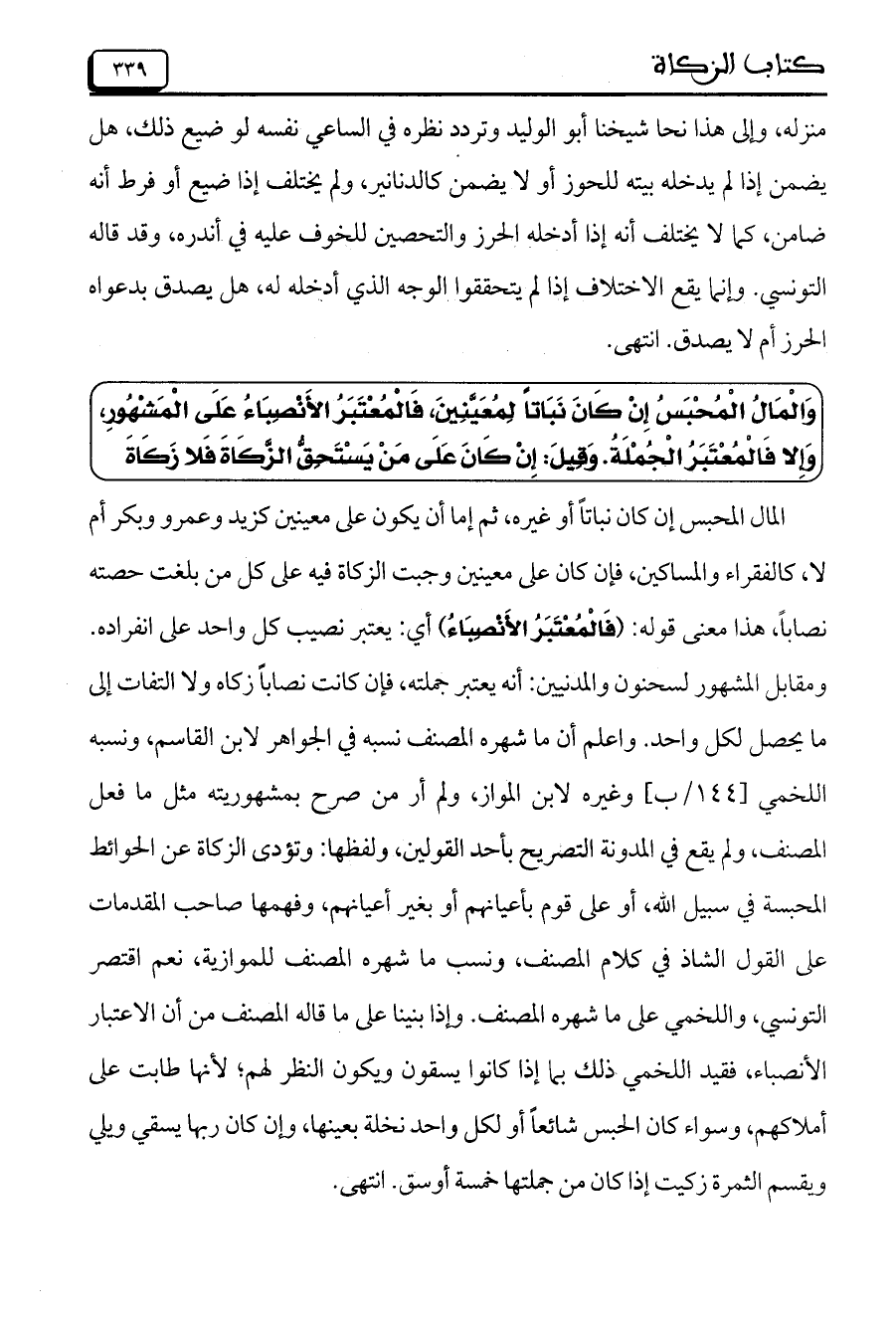 المال المحبس إن كان نباتاً أو غيره، ثم إما أن يكون على معينين كزيد وعمرو وبكر أم لا، كالفقراء والمساكين، فإن كان على معينين وجبت الزكاة فيه على كل من بلغت حصته نصاباً، هذا معنى قوله: (فَالْمُعْتَبَرُ الأَنْصِبَاءُ) أي: يعتبر نصيب كل واحد على انفراده. ومقابل المشهور لسحنون والمدنيين: أنه يعتبر جملته، فإن كانت نصاباً زكاه ولا التفات إلى ما يحصل لكل واحد. واعلم أن ما شهره المصنف نسبه في الجواهر لابن القاسم، ونسبه اللخمي [144/ ب] وغيره لابن المواز، ولم أر من صرح بمشهوريته مثل ما فعل المصنف، ولم يقع في المدونة التصريح بأحد القولين، ولفظها: وتؤدي الزكاة عن الحوائط المحبسة في سبيل الله، أو على قوم بأعيانهم أو بغير أعيانهم، وفهمها صاحب المقدمات على القول الشاذ في كلام المصنف، ونسب ما شهره المصنف للموازية، نعم اقتصر التونسي، واللخمي على ما شهره المصنف. وإذا بنينا على ما قاله المصنف من أن الاعتبار الأنصباء، فقيد اللخمي ذلك بما إذا كانوا يسقون ويكون النظر لهم؛ لأنها طابت على أملاكهم، وسواء كان الحبس شائعاً أو لكل واحد نخلة بعينها، وإن كان ربها يسقي ويلي ويقسم الثمرة زكيت إذا كان من جملتها خمسة أوسق. انتهى.