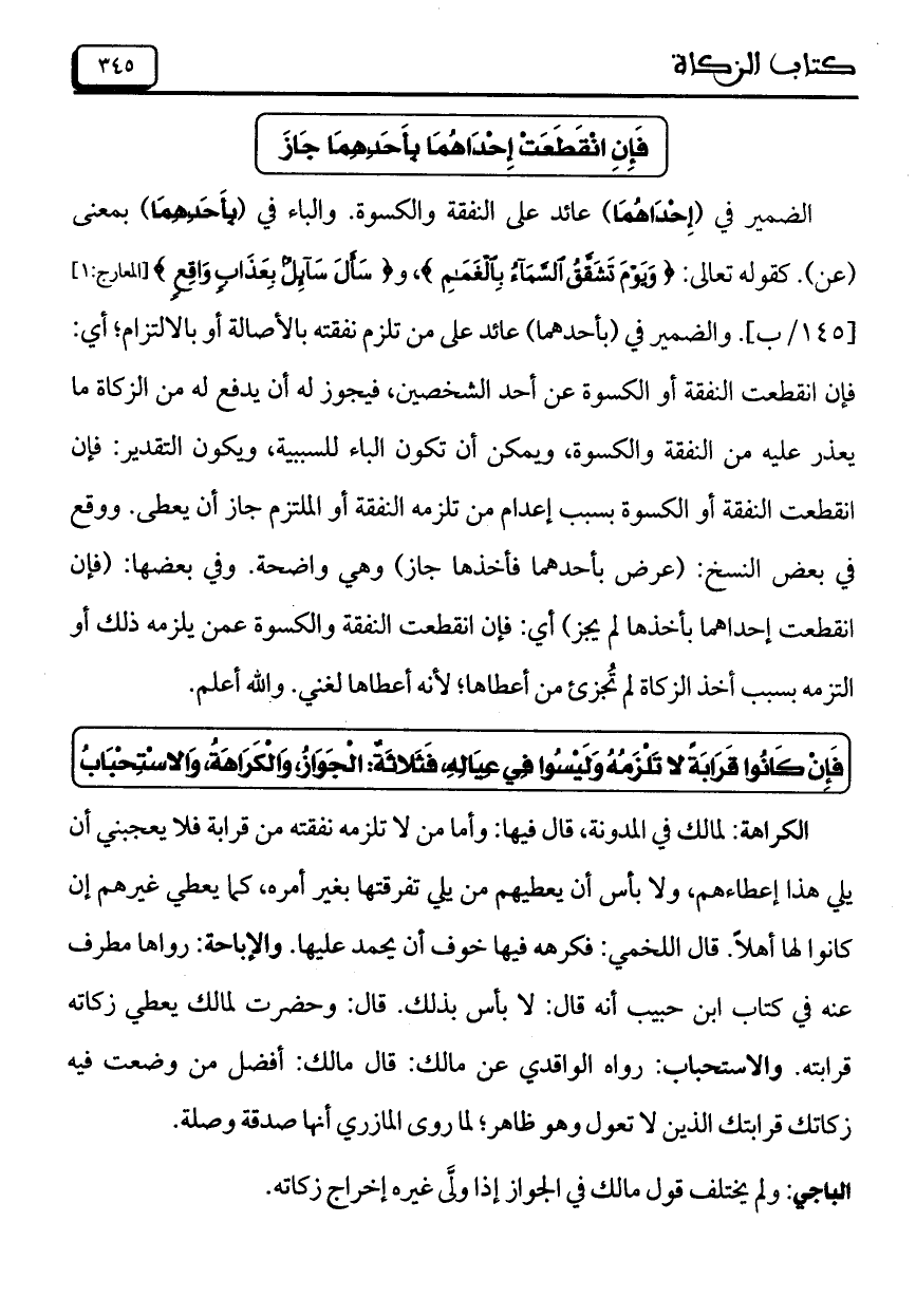 الضمير في (إِحْدَاهُمَا) عائد على النفقة والكسوة. والباء في (بِأَحَدِهِمَا) بمعنى (عن). كقوله تعالى: (يَوْمَ تَشَقَّقُ السَّمَاءُ بِالْغَمَامِ) {يَوْمَ تَشَقَّقُ السَّمَاءُ بِالْغَمَامِ} [المعارج: 1] [145/ ب]. والضمير في (بأحدهما) عائد على من تلزم نفقته بالأصالة أو بالالتزام؛ أي: فإن انقطعت النفقة أو الكسوة عن أحد الشخصين، فيجوز له أن يدفع له من الزكاة ما يعذر عليه من النفقة والكسوة، ويمكن أن تكون الباء للسببية، ويكون التقدير: فإن انقطعت النفقة أو الكسوة بسبب إعدام من تلزمه النفقة أو الملتزم جاز أن يعطى. ووقع في بعض النسخ: (عرض بأحدهما فأخذها جاز) وهي واضحة. وفي بعضها: (فإن انقطعت إحداهما بأخذها لم يجز) أي: فإن انقطعت النفقة والكسوة عمن يلزمه ذلك أو التزمه بسبب أخذ الزكاة لم تُجزئ من أعطاها؛ لأنه أعطاها لغني. والله أعلم.