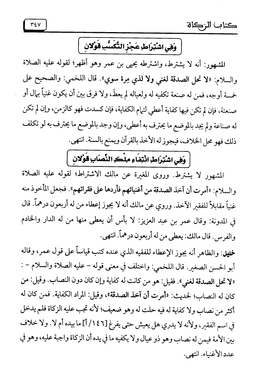 خليل: والظاهر أنه يجوز الإعطاء للفقيه الذي عنده كتب قياساً على قول عمر، وقاله أبو الحسن الصغير. قال اللخمي: واختلف في معنى قوله- عليه الصلاة والسلام-: "لا تحل الصدقة لغني"ز فقيل: هو من كانت له كفاية وإن كان دون النصاب. وقيل: من كان له النصاب؛ لحديث: "أمرت أن آخذ الصدقة"، وقيل: المراد الكفاية. فمن كان له أكثر من نصاب ولا كفاية له فيه حلت له وهو ضعيف؛ لأنه تجب عليه الزكاة فلم يدخل في اسم الفقير، ولأنه لا يدري هل يعيش حتى يفرغ [146/ أ] ما بيده أم لا. ولا خلاف بين الأمة فيمن له نصاب وهو ذو عيال ولا يكفيه ما في يده أن الزكاة واجبة عليه، وهو في عدد الأغنياء. انتهى.