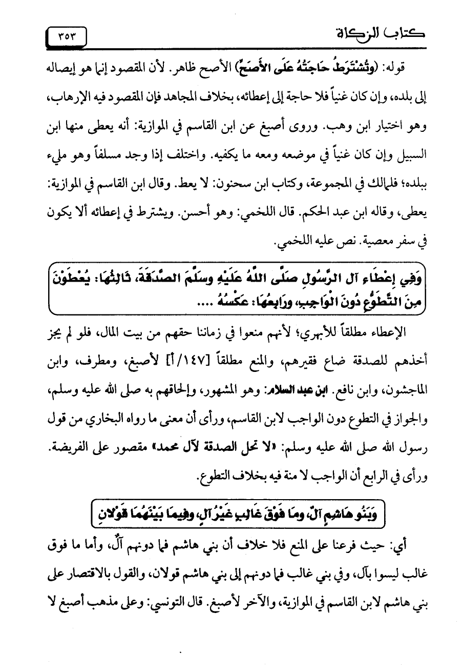 الإعطاء مطلقاً للأبهري؛ لأنهم منعوا في زماننا حقهم من بيت المال، فلو لم يجز أخذهم للصدقة ضاع فقيرهم، والمنع مطلقاً [147/ أ] لأصبغ، ومطرف، وابن الماجشون، وابن نافع. ابن عبد السلام: وهو المشهور، وإلحاقهم به صلى الله عليه وسلم، والجواز في التطوع دون الواجب لابن القاسم، ورأى أن معنى ما رواه البخاري من قول رسول الله صلىى الله عليه وسلم: "لا تحل الصدقة لآل محمد" مقصور على الفريضة. ورأى في الرابع أن الواجب لا منة فيه بخلاف التطوع.