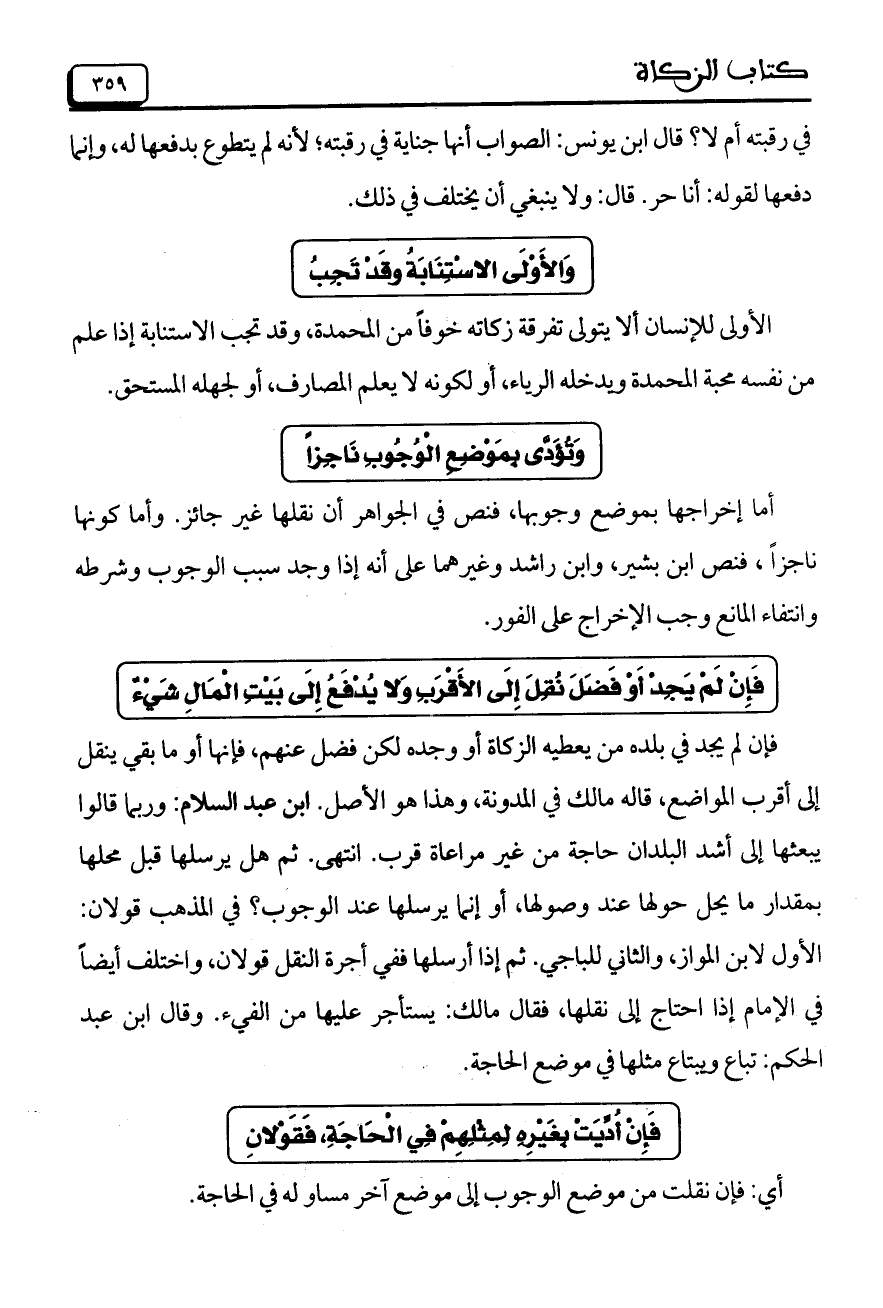 فإن لم يجد في بلده من يعطيه الزكاة أو وجده لكن فضل عنهم، فإنها أو ما بقي ينقل إلى أقرب المواضع، قاله مالك في المدونة، وهذا هو الأصل. ابن عبد السلام: وربما قالوا بمقدار ما يحل حولها عند وصولها، أو إنما يرسلها عند الوجوب؟ في المذهب قولان: الأول لابن المواز، والثاني للباجي. ثم إذا أرسلها ففي أجرة النقل قولان، واختلف أيضاً في الإمام إذا احتاج إلى نقلها، فقال مالك: يستأجر عليها من الفيء. وقال ابن عبد الحكم: تباع ويبتاع مثلها في موضع الحاجة.