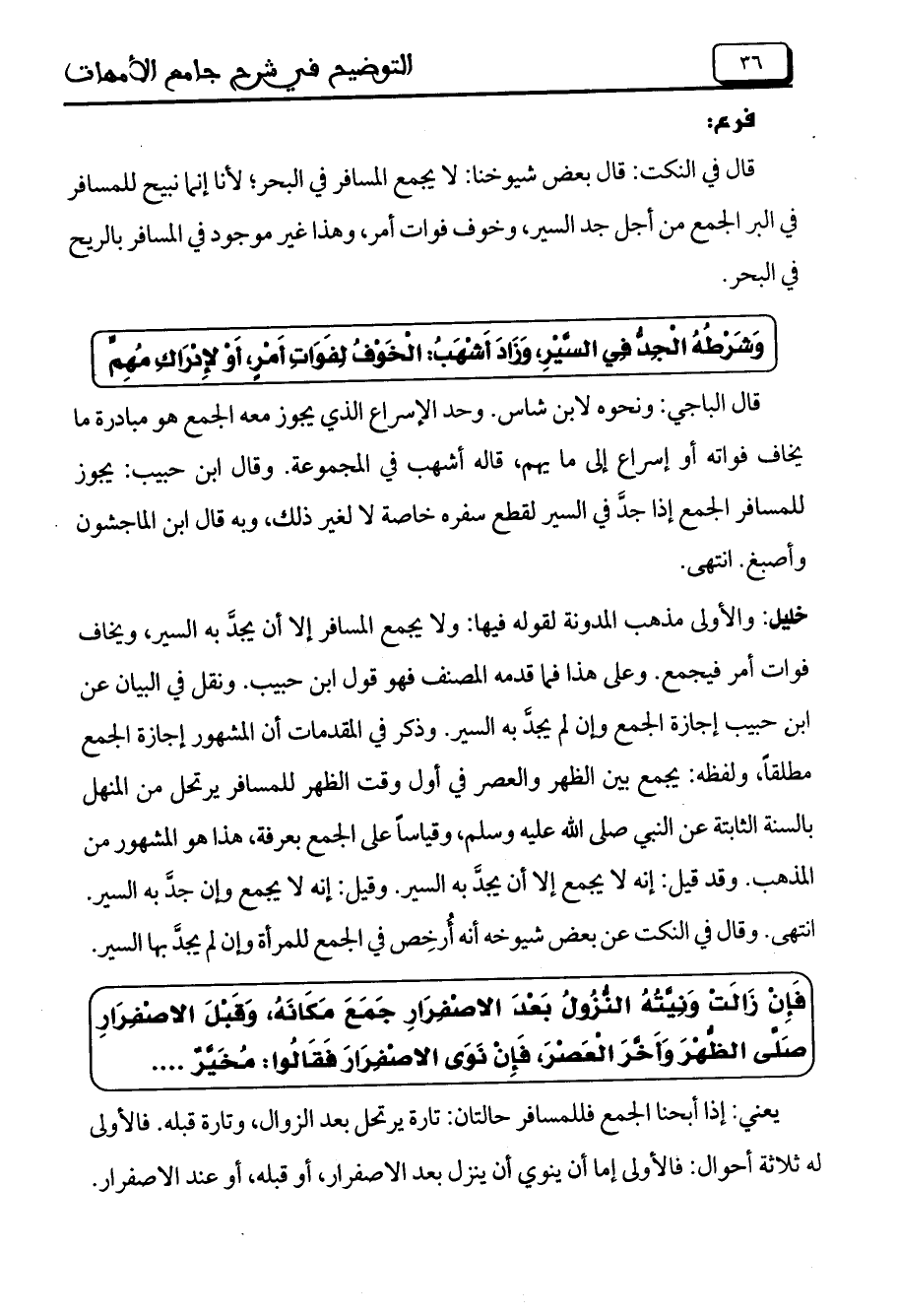 خليل: والأولى مذهب المدونة لقوله فيها: ولا يجمع المسافر إلا أن يجدَّ به السير، ويخاف فوات أمر فيجمع. وعلى هذا فما قدمه المصنف فهو قول ابن حبيب. ونقل في البيان عن ابن حبيب إجازة الجمع وإن لم يجدَّ به السير. وذكر في المقدمات أن المشهور إجازة الجمع مطلقاً، ولفظه: يجمع بين الظهر والعصر في أول وقت الظهر للمسافر يرتحل من المنهل بالسنة الثابتة عن النبي صلى الله عليه وسلم، وقياساً على الجمع بعرفة، هذا هو المشهور في المذهب. وقد قيل: إنه لا يجمع إلا أن يجدَّ به السير. وقيل: إنه لا يجمع وإن جدَّ به السير. انتهى. وقال في النكت عن بعض شيوخه أنه أرخص في الجمع للمرأة وإن لم يجدَّ بها السير.