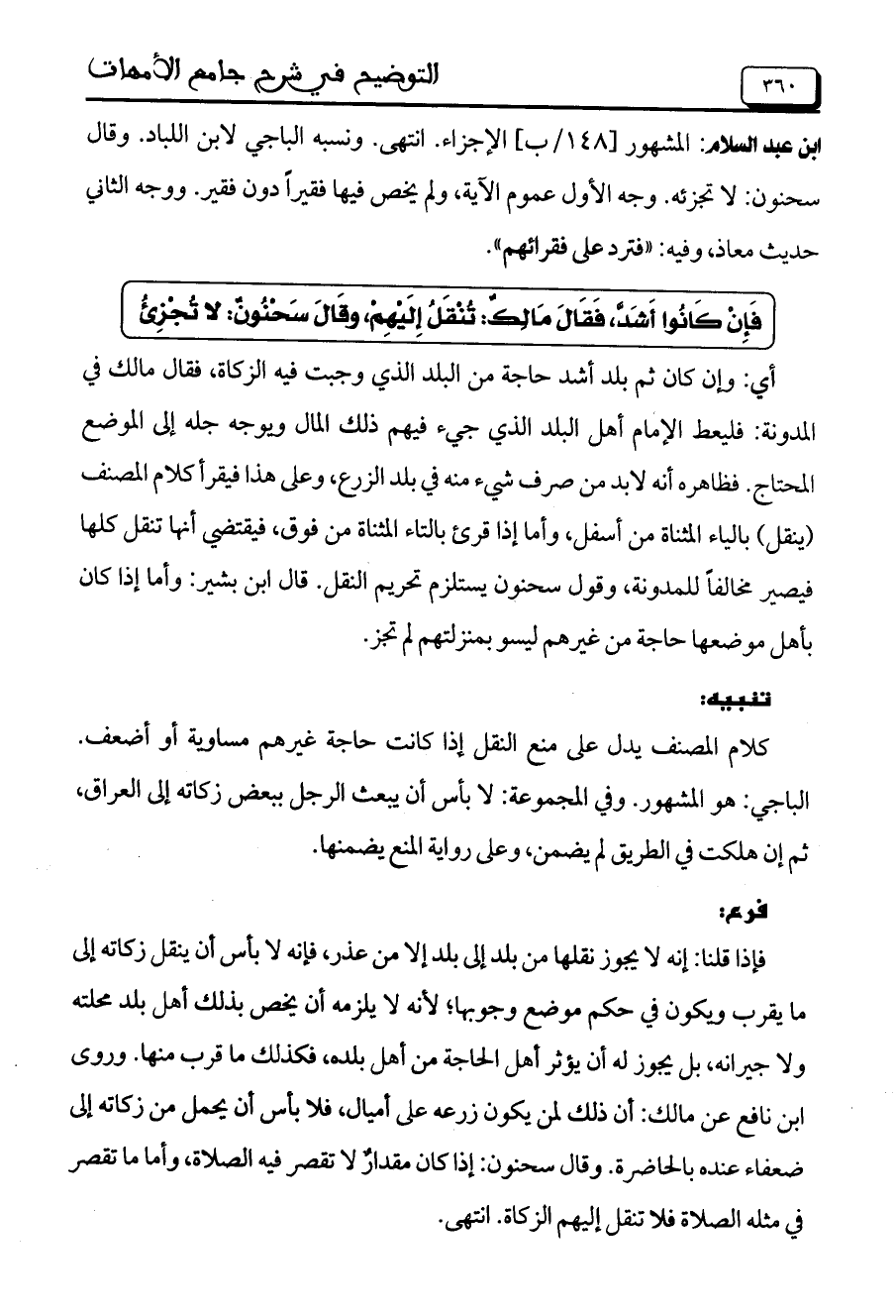 أي: وإن كان ثم بلد أشد حاجة من البلد الذي وجبت فيه الزكاة، فقال مالك في المدونة: فليعط الإمام أهل البلد الذي جيء فيهم ذلك المال ويوجه جله إلى الموضع المحتاج. فظاهره أنه لا بد من صرف شيء منه في بلد الزرع، وعلى هذا فيقرأ كلام المصنف (ينقل) بالياء المثناة من أسفل، وأما إذا قرئ بالتاء المثناة من فوق، فيقتضي أنها تنقل كلها فيصير مخالفاً للمدونة، وقول سحنون يستلزم تحريم النقل. قال ابن بشير: وأما إذا كان بأهل موضعها حاجة من غيرهم ليسو بمنزلتهم لم تجز.