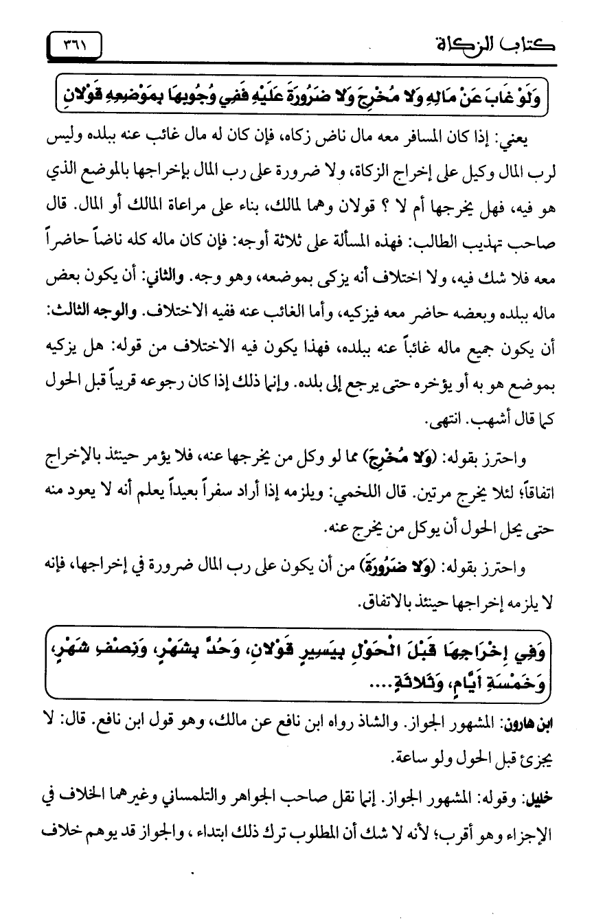 يعني: إذا كان المسافر معه مال ناض زكاه، فإن كان له مال غائب عنه ببلده وليس لرب المال وكيل على إخراج الزكاة، ولا ضرورة على رب المال بإخراجها بالموضع الذي هو فيه، فهل يخرجها أم لا؟ قولان وهما لمالك، بناء على مراعاة المالك أو المال. قال صاحب تهذيب الطالب: فهذه المسألة على ثلاثة أوجه: فإن كان ماله كله ناضاً حاضراً معه فلا شك فيه، ولا اختلاف أنه يزكى بموضعه، وهو وجه. والثاني: أن يكون بعض ماله ببلده وبعضه حاضر معه فيزكيه، وأما الغائب عنه ففيه الاختلاف. والوجه الثالث: أن يكون جميع ماله غائباً عنه ببلده، فهذا يكون فيه الاختلاف من قوله: هل يزكيه بموضع هو به أو يؤخره حتى يرجع إلى بلده. وإنما ذلك إذا كان رجوعه قريباً قبل الحول كما قال أشهب. انتهى.
