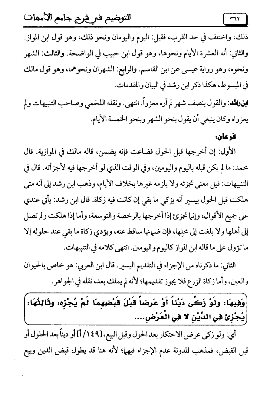 الأول: إن أخرجها قبل الحول فضاعت فإنه يضمن، قاله مالك في الموازية. قال محمد: ما لم يكن قبله باليوم واليومين، وفي الوقت الذي لو أخرجها فيه لأجزأته. قال في التنبيهات: قيل معنى تجزئه ولا يلزمه غيرها بخلاف الأيام، وذهب ابن رشد إلى أنه متى هلكت قبل الحول بيسير أنه يزكي ما بقي إن كانت فيه زكاة. قال ابن رشد: يأتي عندي على جميع الأقوال، وإنما تجزئ إذا أخرجها بالرخصة والتوسعة، وأما إذا هلكت ولم تصل إلى أهلها ولا بلغت إلى محلها، فإن ضمانها ساقط عنه، ويؤدي زكاة ما بقي عند حلوله إلا ما تؤول على ما قاله ابن المواز كاليوم واليومين. انتهى كلامه في التنبيهات.