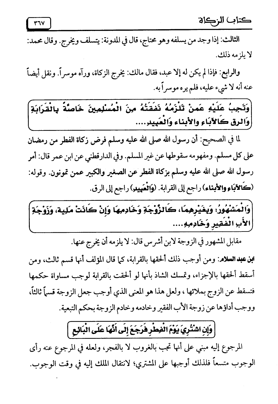 وَتَجِبُ عَلَيْهِ عَمنْ تَلْزَمُهُ نَفَقَتُهُ مِنَ الْمُسْلِمِينَ خَاصَّةً بِالْقَرَابَةِ وَالرق كالآبَاءِ والأبناء والْعَبِيدِ ....