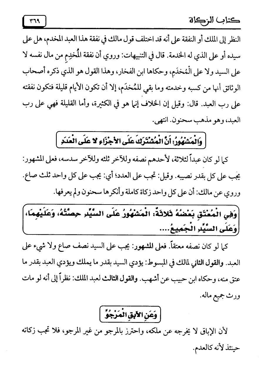 كما لو كان عبداً لثلاثة، لأحدهم نصفه وللآخر ثلثه وللآخر سدسه، فعلى المشهور: يجب على كل بقدر نصيبه. وقيل: تجب على العدد؛ أي: يجب على كل واحد ثلث صاع. وروي عن مالك: أن على كل واحد زكاة كاملة وأنكرها سحنون ولم يعرفها.