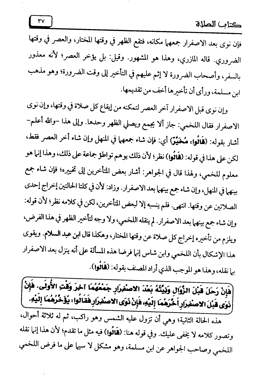 وإن نوى قبل الاصفرار آخر العصر لتمكنه من إيقاع كل صلاة في وقتها، وإن نوى الاصفرار فقال اللخمي: جاز ألا يجمع ويصلي الظهر وحدها. وإلى هذا -والله أعلم- أشار بقوله: (قَالُوا: مُخَيَّرٌ) أي: فإن شاء جمعهما في المنهل وإن شاء أخر العصر فقط، لكن على هذا في قوله: (قَالُوا) نظر؛ لأن ذلك يوهم تواطؤ جماعة على ذلك، وهذا إنما هو معلوم للخمي، ولهذا قال في الجواهر: أشار بعض المتأخرين إلى تخييره؛ فإن شاء جمع بينهما في المنهل، وإن شاء جمع بينهما بعد الاصفرار. وزاد: لأن في كلتا الحالتين إخراج إحدى الصلاتين عن وقتها. انتهى. فلم ينسبه إلا لبعض المتأخرين، لكن في كلامه نظر؛ لأن قوله: وإن شاء جمع بينهما بعد الاصفرار. لم ينقله اللخمي، ولا وجه لتأخير الظهر في هذا الفرض، ويلزم من تأخيره إخراج كل صلاة عن وقتها المختار، وهكذا قال ابن عبد السلام. ويقوي هذا الإشكال بأن اللخمي وابن شاس إنما فرضا هذه المسألة على أنه ينزل بعد الاصفرار بما نقله، وهذا هو الموجب الذي أراد المصنف بقوله: (قَالُوا).