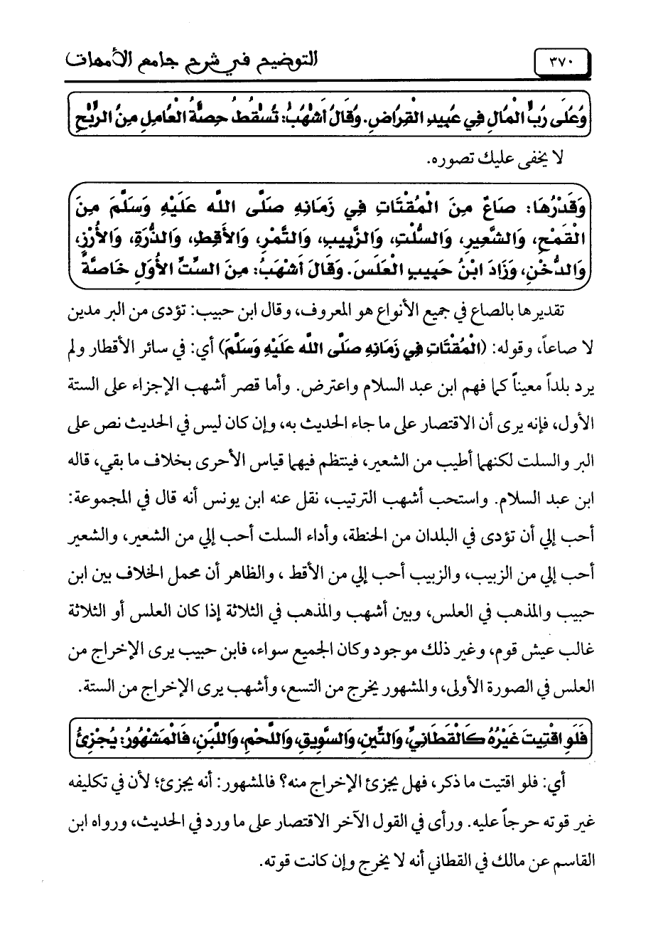 تقديرها بالصاع في جميع الأنواع هو المعروف، وقال ابن حبيب: تؤدي من البر مدين لا صاعاً، وقوله: (الْمُقْتَاتِ فِي زَمَانِهِ صَلَّى الله عَلَيْهِ وَسَلَّمَ) أي: في سائر الأقطار ولم يرد بلداً معيناً كما فهم ابن عبد السلام واعترض. وأما قصر أشهب الإجزاء على الستة الأول، فإنه يرى أن الاقتصار على ما جاء الحديث ب، وإن كان ليس في الحديث نص على البر والسلت لكنهما أطيب من الشعير، فينتظم فيهما قياس الأحرى بخلاف ما بقي، قاله ابن عبد السلام. واستحب أشهب الترتيب، نقل عنه ابن يونس أنه قال في المجموعة: أحب إلى أن تؤدي في البلدان من الحنطة، وأداء السلت أحب إلى من الشعير، والشعير أحب إلى من الزبيب، والزبيب أحب إلى من الأقط، والظاهر أن محمل الخلاف بين ابن حبيب والمذهب في العلس، وبين أشهب والمذهب في الثلاثة إذا كان العلس أو الثلاثة غالب عيش قوم، وغير ذلك موجود وكان الجميع سواء، فابن حبيب يرى الإخراج من العلس في الصورة الأولى، والمشهور يخرج من التسع، وأشهب يرى الإخراج من الستة.