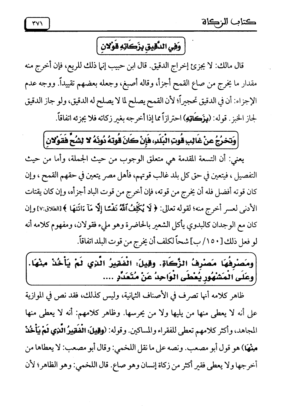 ظاهر كلامه أنها تصرف في الأصناف الثمانية، وليس كذلك، فقد نص في الموازية على أ، هـ لا يعطى منها من يليها ولا من يحرصها. وظاهر كلامهم: أنه لا يعطى منها المجاهد، وأكثر كلامهم تعطى للفقراء والمساكين. وقوله: (وقِيلَ: الْفَقِيرُ الَّذِي لَمْ يَاخُذْ مِنْهَا) هو قول أبو مصعب. ونصه على ما نقل اللخمي: وقال أبو مصعب: لا يعطاها من أخرجها ولا يعطى فقير أكثر من زكاة إنسان وهو صاع. قال اللخمي: وهو الظاهر؛ لأن