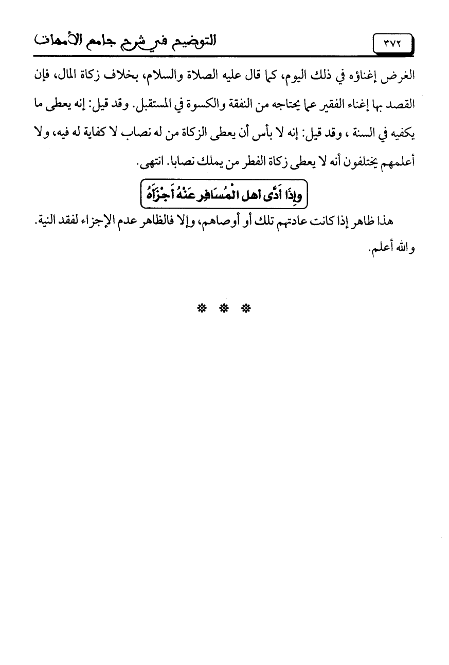 الغرض إغناؤه في ذلك اليوم، كما قال عليه الصلاة والسلام، بخلاف زكاة المال، فإن القصد بها إغناء الفقير عما يحتاجه من النفقة والكسوة في المستقبل. وقد قيل: إنه يعطي ما يكفيه في السنة، وقد قيل: إنه لا بأس أن يعطي الزكاة من له نصاب لا كفاية له فيه، ولا أعلمهم يختلفون أنه لا يعطى زكاة الفطر من يملك نصاباً. انتهى.