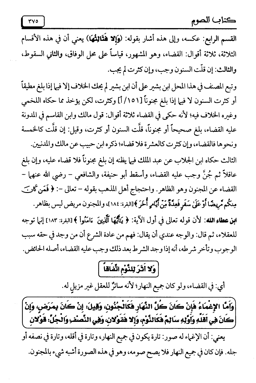 ابن عطاء الله: لأن قوله تعالى في أول الآية: {يَا أَيُّهَا الَّذِينَ آمَنُوا} [البقرة: 183] إنما توجه للعقلاء، ثم قال: والوجه عندي أن يقال: فهم من عادة الشرع أن من وجد في حقه سبب الوجوب وتأخر شرطه، أنه إذا وجد الشرط بعد ذلك وجب عليه القضاء، أصله الحائض.