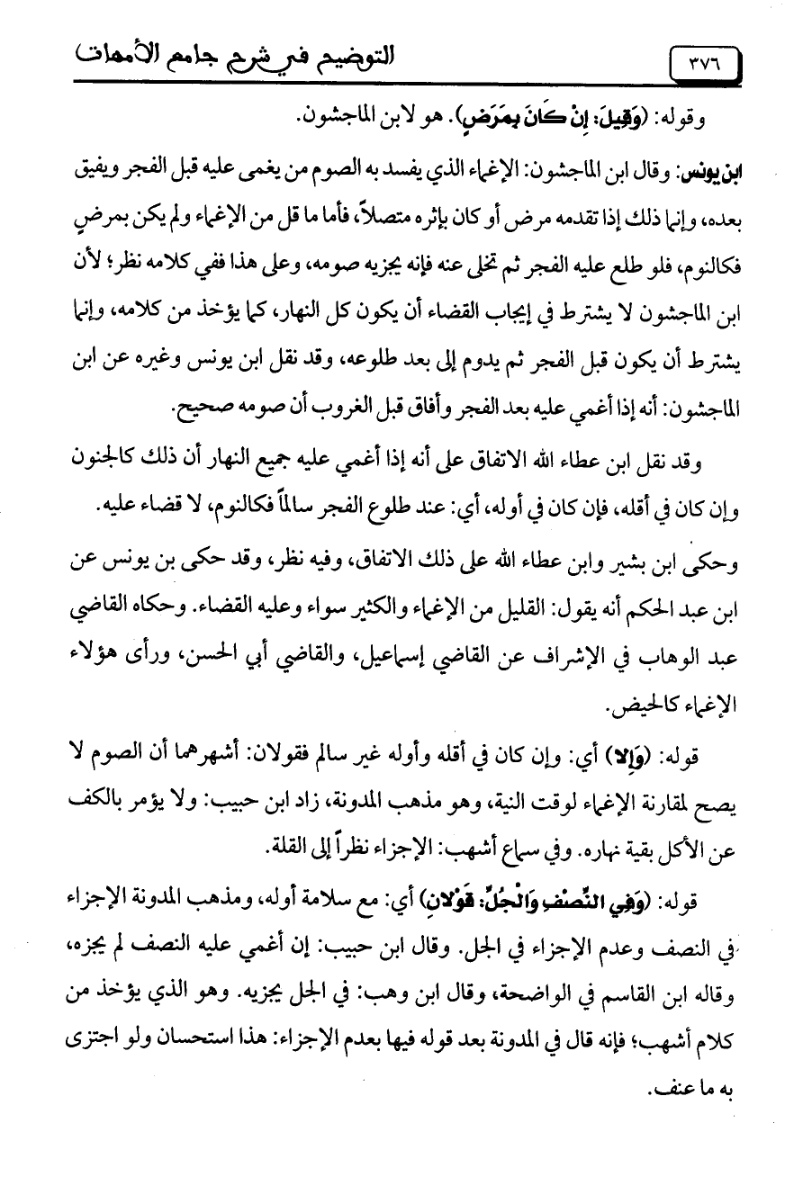 ابن يونس: وقال ابن الماجشون: الإغماء الذي يفسد به الصوم من يغمى عليه قبل الفجر ويفيق بعده، وإنما ذلك إذا تقدمه مرض أو كان بإثره متصلاً، فأما ما قل من الإغماء ولم يكن بمرض فكالنوم، فلو طلع عليه الفجر ثم تخلى عنه فإنه يجزيه صومه، وعلى هذا ففي كلامه نظر؛ لأن ابن الماجشون لا يشترط في إيجاب القضاء أن يكون كل النهار، كما يؤخذ من كلامه، وإنما يشترط أن يكون قبل الفجر ثم يدوم إلى بعد طلوعه، وقد نقل ابن يونس وغيره عن ابن الماجشون: أنه إذا أغمي عليه بعد الفجر وأفاق قبل الغروب أن صومه صحيح.