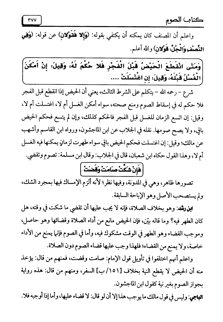شرع- رحمه الله- يتكلم على الشرط الثالث: يعني أن الحيض إذا انقطع قبل الفجر فلا حكم له في إسقاط الصوم ومنع صحته، سواء أمكن الغسل أم لا، اغتسلت أم لا، وقيل: إن اتسع الزمان للغسل قبل الفجر فالحكم كذلك، وإن لم يتسع فحكم الحيض باقٍ، ولا يصح صومها. نقله في الجلاب عن ابن الماجشون، ورواه ابن القاسم وأشهب عن مالك؛ وقيل: إن اغتسلت فحكم الحيض باقٍ سواء طهرت لزمانٍ يمكنها فيه الغسل أم لا، وهذا القول حكاه ابن شعبان، قال في الجلاب: وقال ابن مسلمة: تصوم وتقضي.