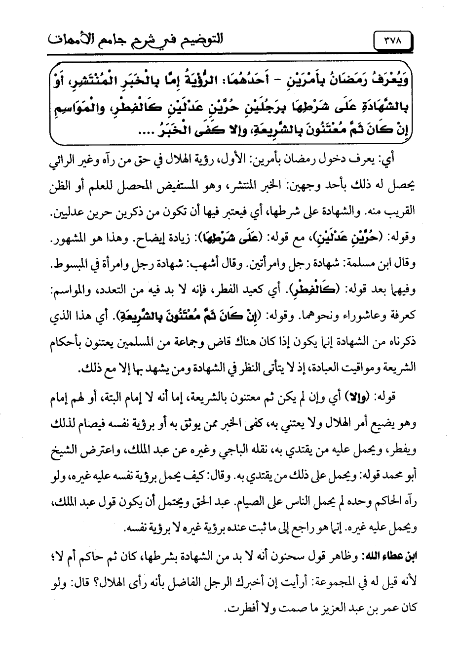 وَيُعْرَفُ رَمَضانُ بِأَمْرَيْنِ – أَحَدُهُمَا: الرُّؤْيَةُ إِمَّا بِالْخَبَرِ الْمُنْتَشِرِ، أَوْ بِالشَّهَادَةِ عَلَى شَرْطِهَا بِرْجُلَيْنِ حُرَّيْنِ عَدْلَيْنِ كَالْْفِطْرِ، وَالْمَوَاسِمِ إِنْ كَانَ ثَمَّ مُعْتَنُونَ بِالشَّرِيعَةِ، وَإلّا كَفَى الْخَبَرُ ....
